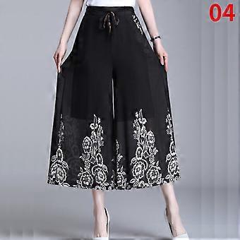 Ladies Cropped Pants Chiffon Flower Print Wide-leg Trousers Culottes 2 Layers