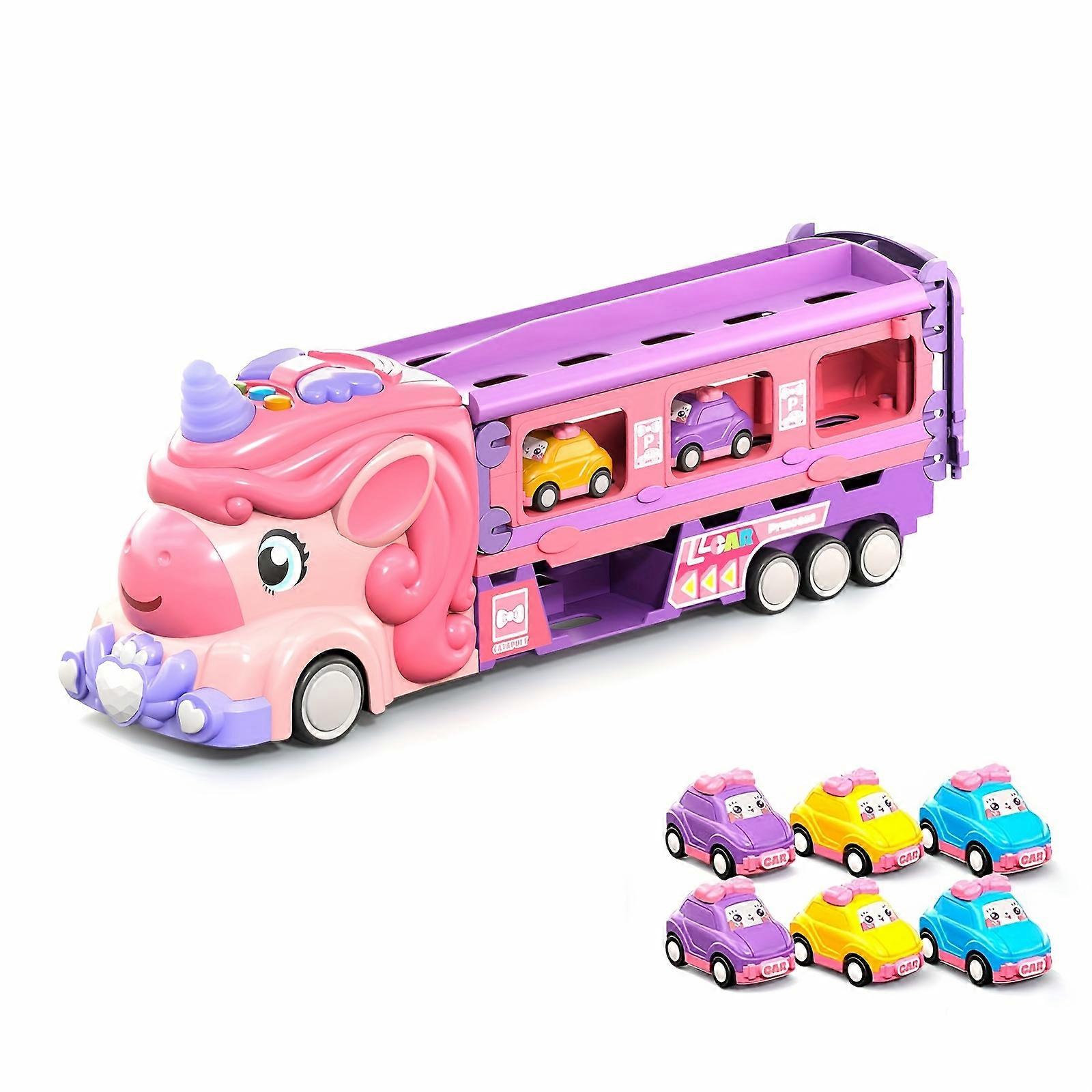 Pink Transport Truck Car Toy w/ Extended Track Mode, Foldable Storage, Lights & Music Effects, Include 6 Mini Cars, for Kids Toy