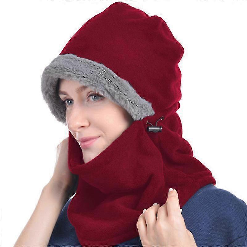 Unisex loose-fitting knitted cap, scarf, face mask, drawstring warm hood, winter pullover. RED