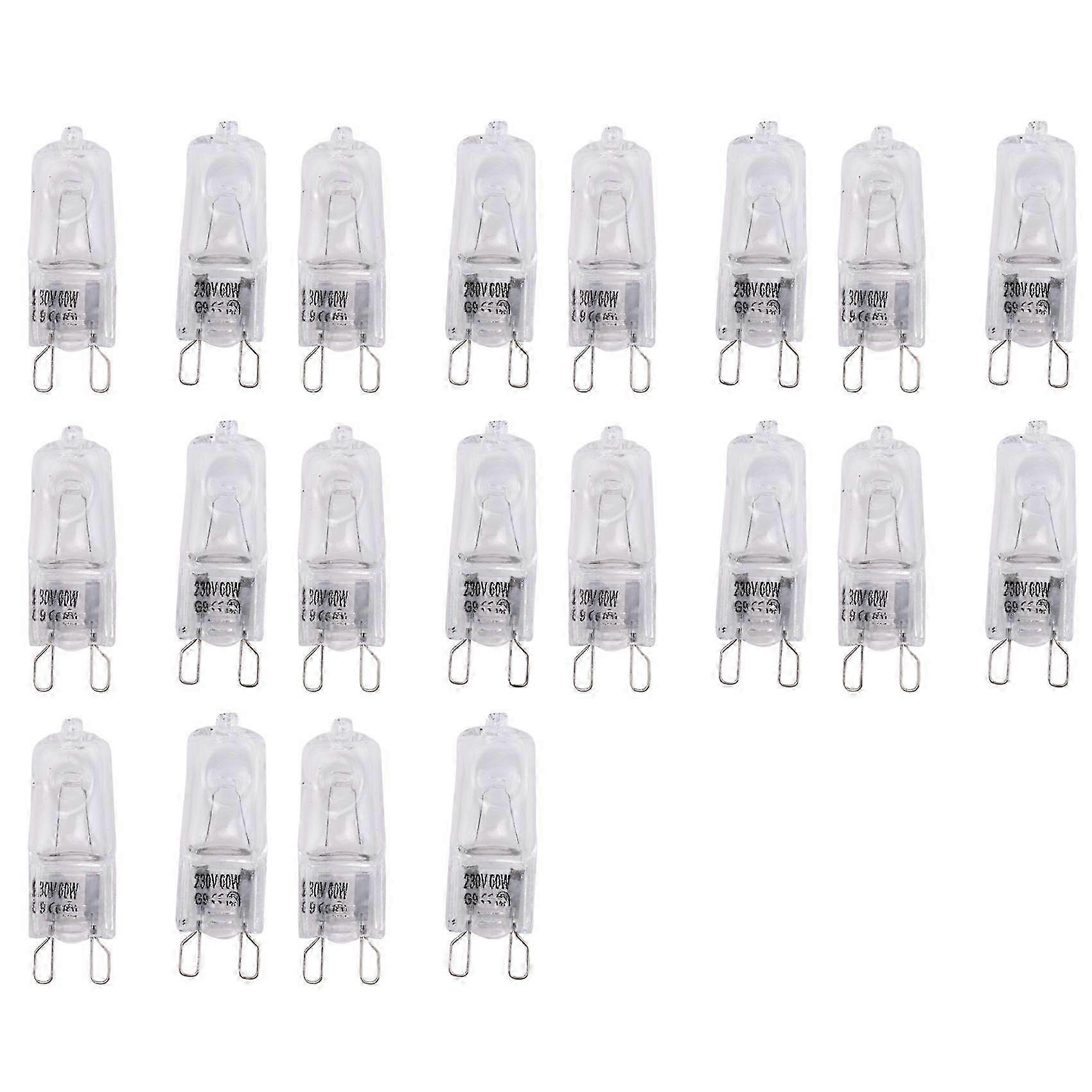 20Pcs of a G9 Dimmable Halogen Light Bulb, a 60W Clear Lamp in Warm White 2800K for Chandeliers, Pendants, and Landscape Lights.
