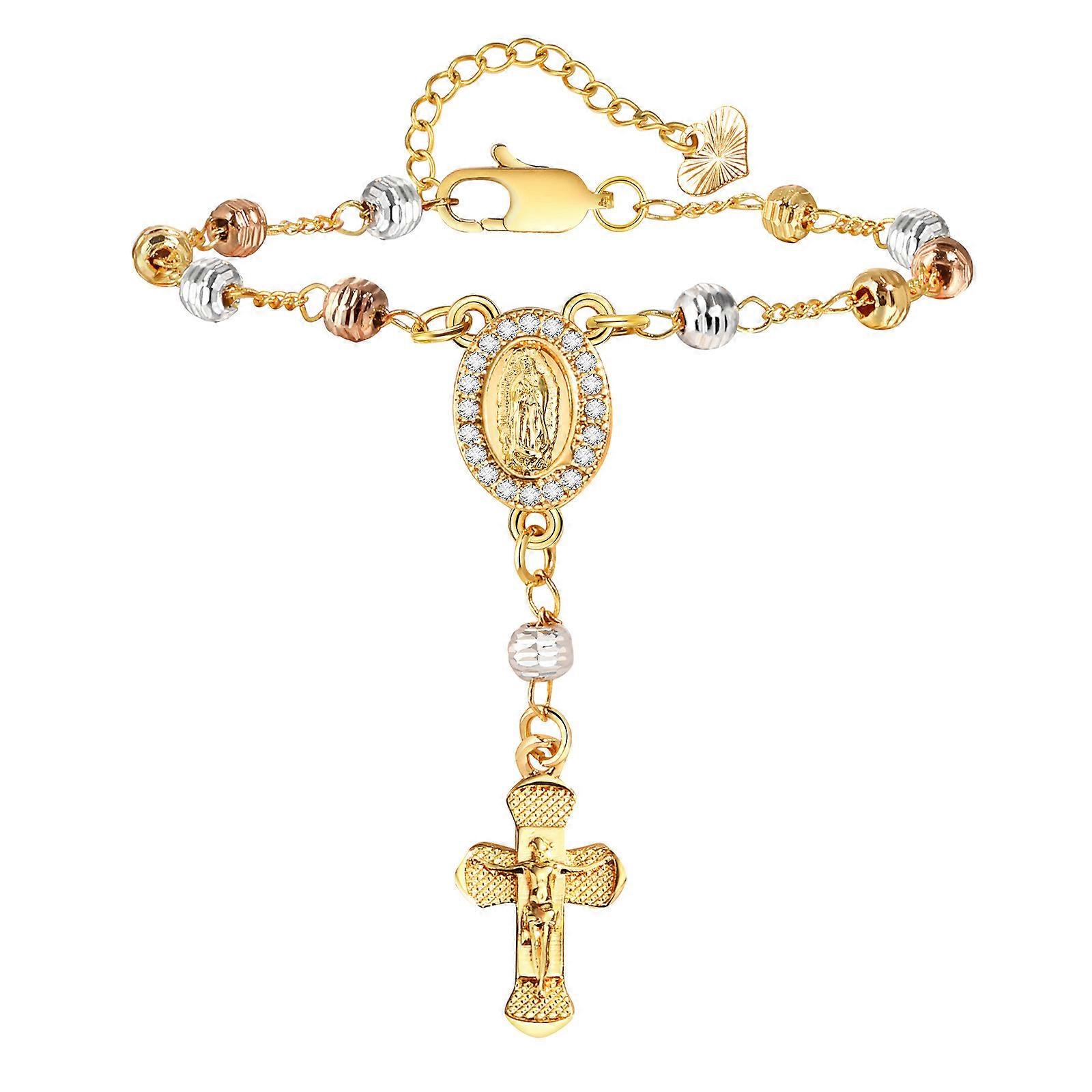 Brass Flower Bead Oval Madonna Pendant Cross Bracelet Women's Accessory