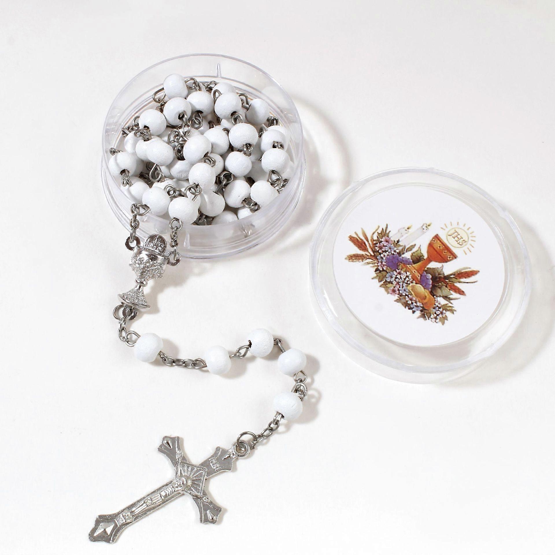 White Holy Urn Communion Ros Holy Grail IHS Cross Baptism Hexagonal Box Wooden Rosary Necklace