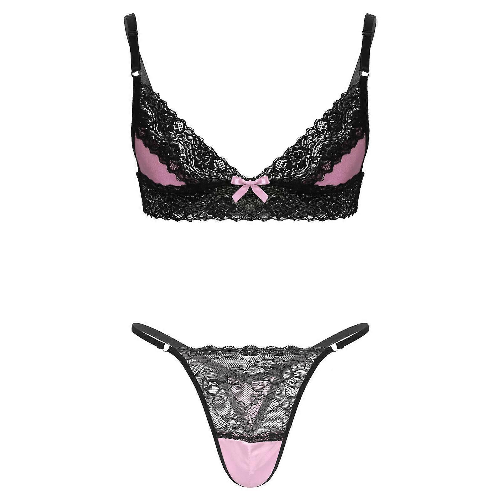 Men's Sissy Lingerie Set Satin Lace Trim Bra Tops with G-string Thong Underwear