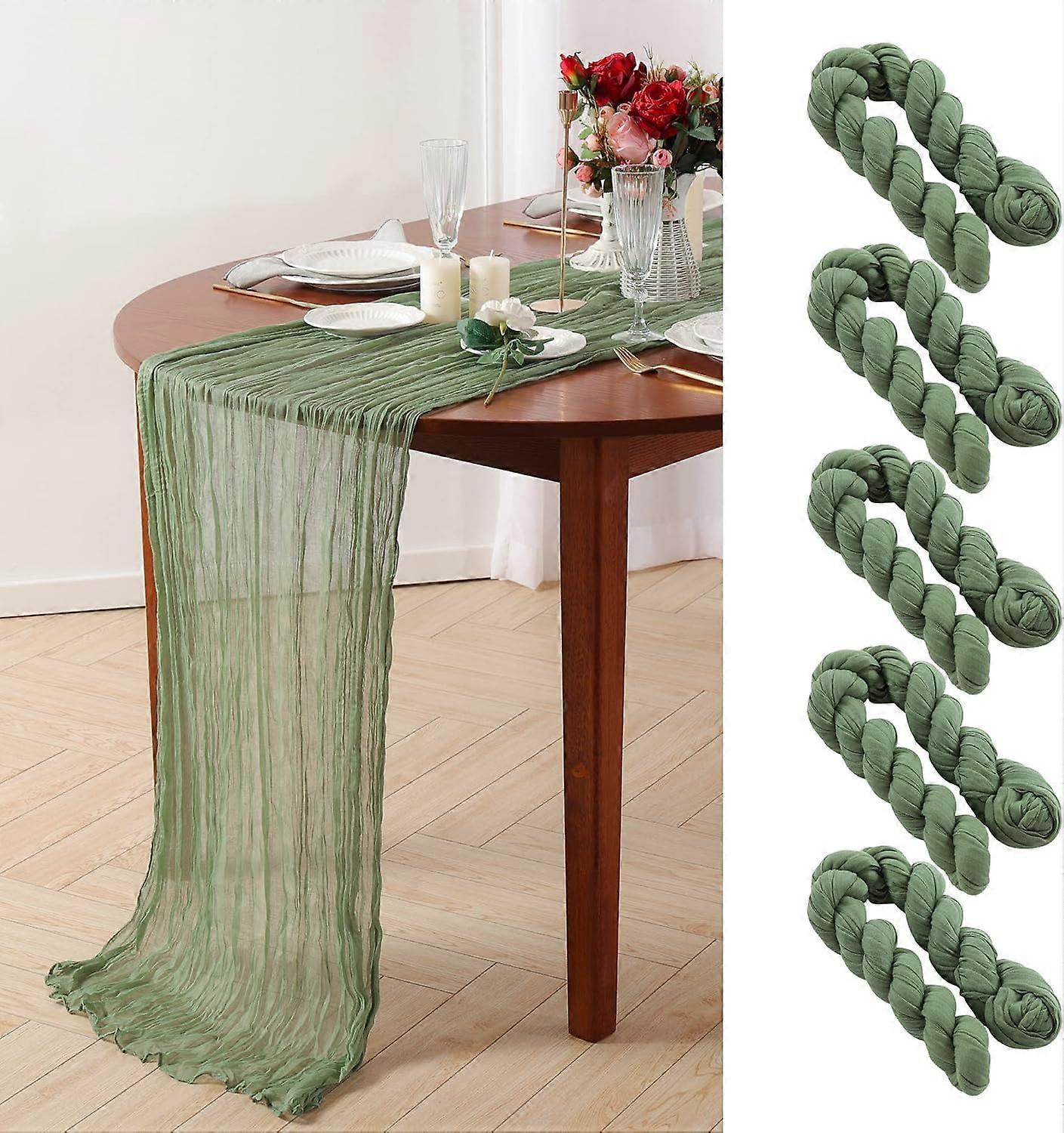 <p>MATERIAL - Polyester. This is a lightweight and sheer fabric with a pleated texture, elegant shimmer, and soft hand feel.SAGE GREEN LONG TABLE RUNNER - Package includes 5 Piece long cheesecloth runner. The size is 35 inches wide and 118 inches long, suitable for decorating most types of tables. If you have a large table and want more drape on both sides, you can also use multiple table runners together to achieve more fullness.WIDELY APPLICATIONS - This boho table runner is perfect for bridal and baby showers, weddings, graduation parties and other special holiday parties, such as Christmas, Thanksgiving, Anniversary...SIMPLE BUT ELEGANT - With the help of its sheerness and light wrinkle you can easily set a vibes of romantic and elegant for your tablescape or photo backdrop.HOW TO CARE - Hand wash. Or machine wash in a laundry bag. High temperature will destroy the wrinkled texture, please dry flat or tie in a ball to preserve the wrinkled finish. Because of its fabric style it may snag easily if your table or chairs have a rough surface.</p>
