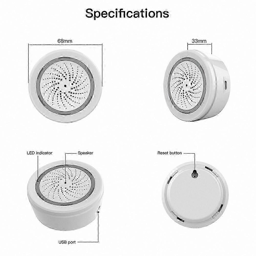 Tuya WiFi Intelligent Siren Sensor with Audible and Visual Alarm 90dB Loud Alarm APP Remote Control Home Safety System Compatible with Smart Life This 2-in-1 alarm system features a 90dB loud sound and flashing light, designed for home safety with real-time alarm alerts and timely detection of home conditions. Features: - 90dB loud alarm with 18 selectable alarm ringtones - Dual power options: USB cable powered or battery powered; battery level and low battery notifications available via smartphone app - Supports remote control through mobile app - Works with other smart home devices to trigger alarms; integrate with motion sensors to activate alarm upon detecting human presence - Power-off memory function - Share device access with family members for shared control of the siren alarm - View alarm history and automation logs remotely on smartphones Specifications: - Color: White - Material: Plastic - Sound output: 90dB - Battery: 2 x CR123A 3V (not included) - Device dimensions: 68 x 68 x 33mm / 2.7 x 2.7 x 1.3in - Package dimensions: 95 x 85 x 50mm / 3.7 x 3.3 x 2.0in - Package weight: 110g / 3.9oz Package Contents: - 1 x Siren Alarm - 1 x Screw - 1 x Sticker - 1 x User Manual - 1 x USB Cable
