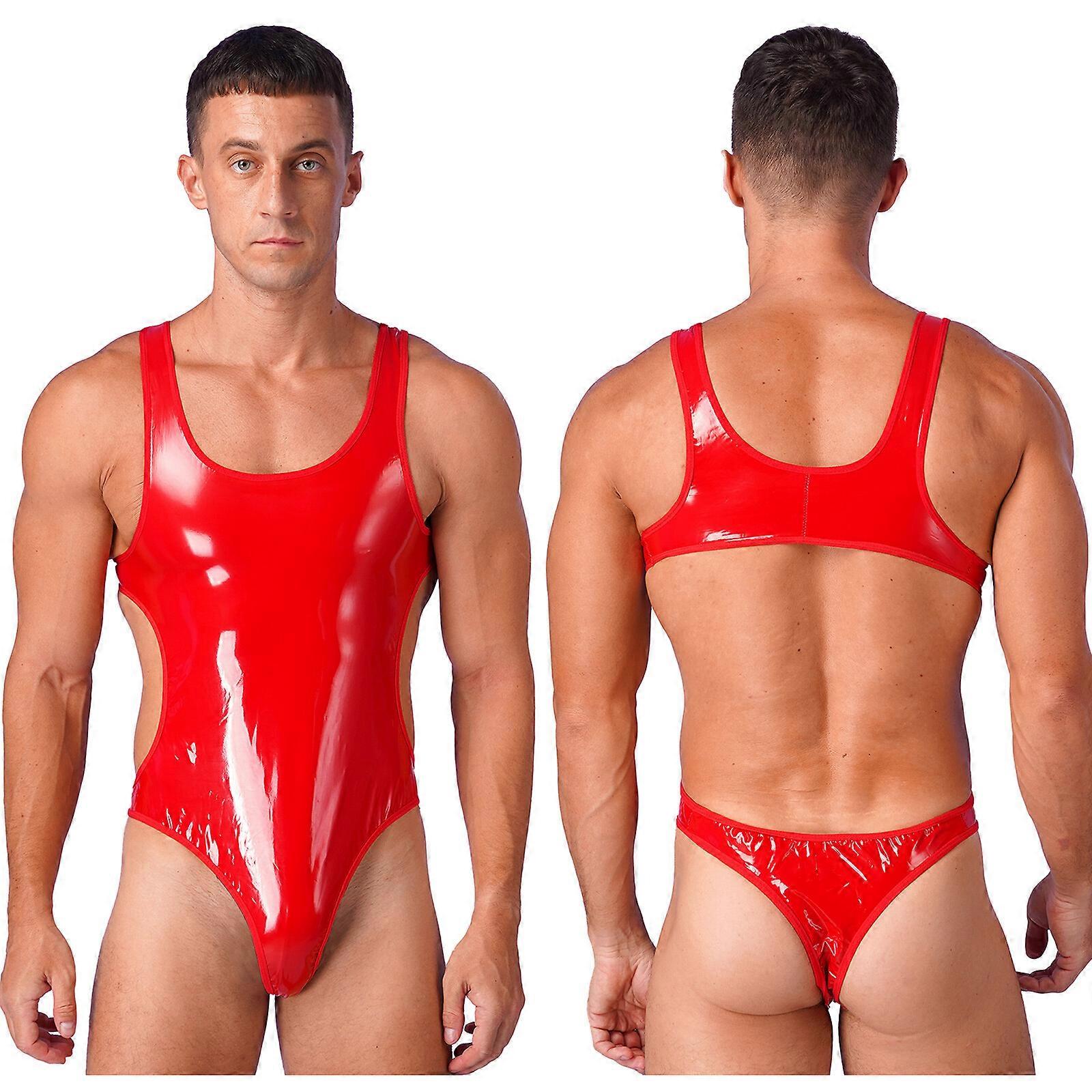 Men's Wet Look Patent Leather High Cut Thongs Leotards Sissy Sleeveless Bodysuit