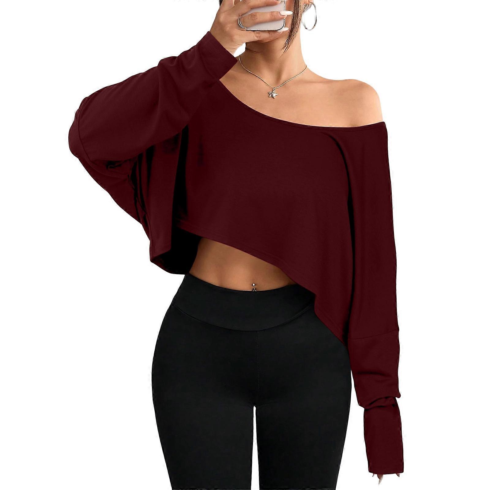 Womens Off Shoulder Long Sleeve Crop Tops Sexy Boat Neck Loose Casual T Shirt Burgundy XL