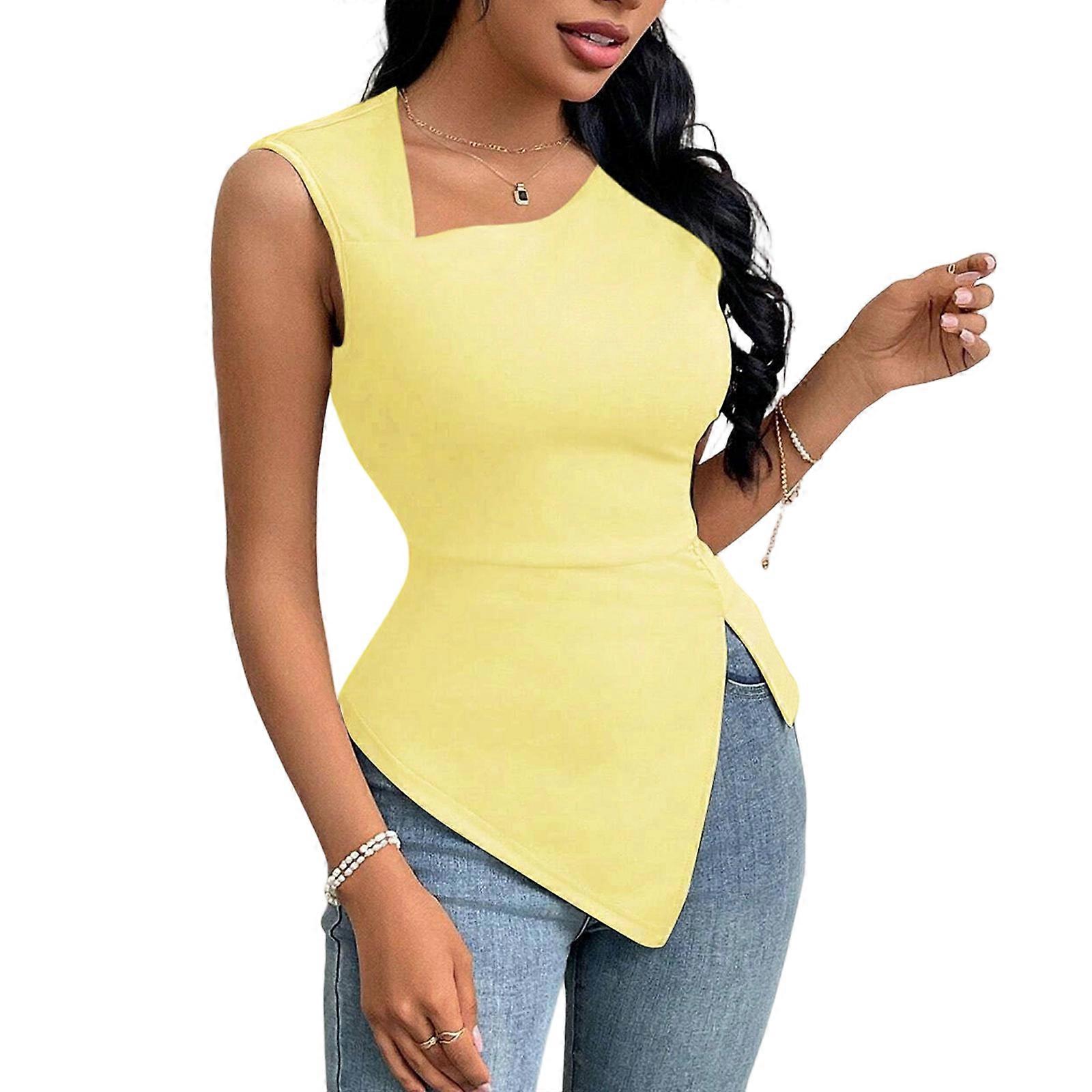 Women's sleeveless top with pleated design, asymmetrical , slit cut, and fit. light yellow XL