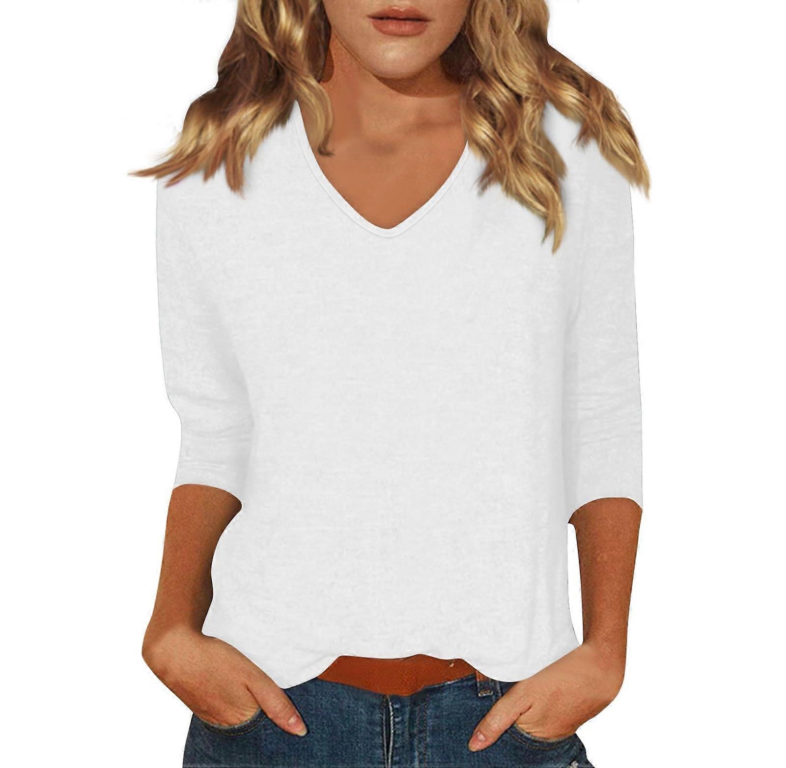 3/4 Sleeve For Women V Neck Fashion Solid Color Top Beach Vacation Clothes Business Casual Shirt White XL