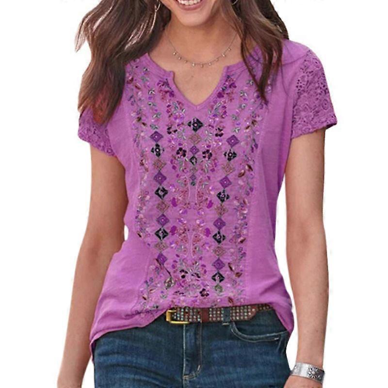 Women V Neck Floral Tops Ladies Summer Casual Short Sleeve Loose T-shirt Blouse