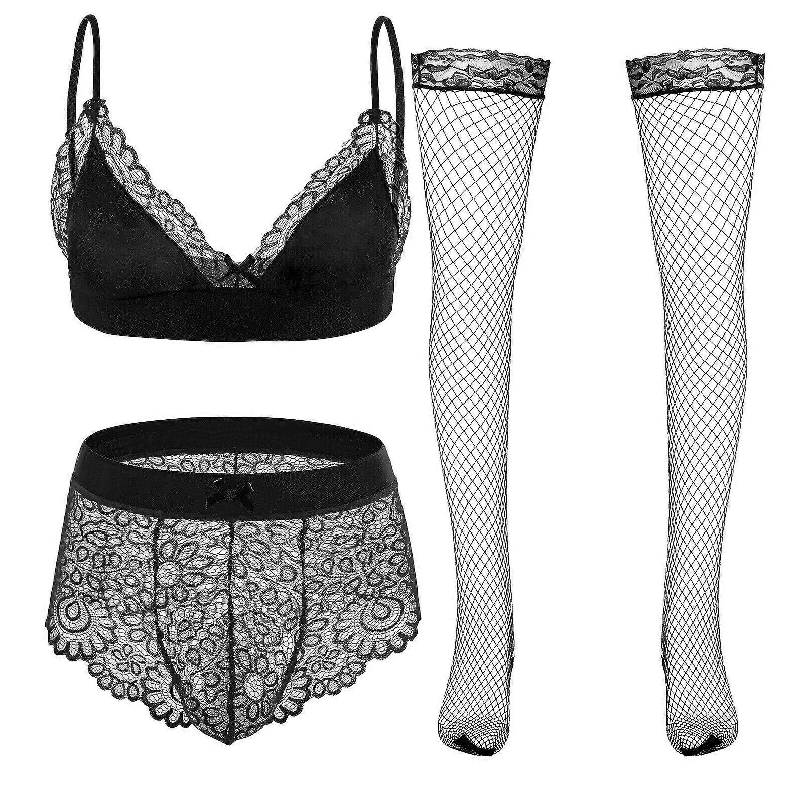 Men Sissy Lace Lingerie Bra Top Crossdress Underwear High Tight Stocking Costume