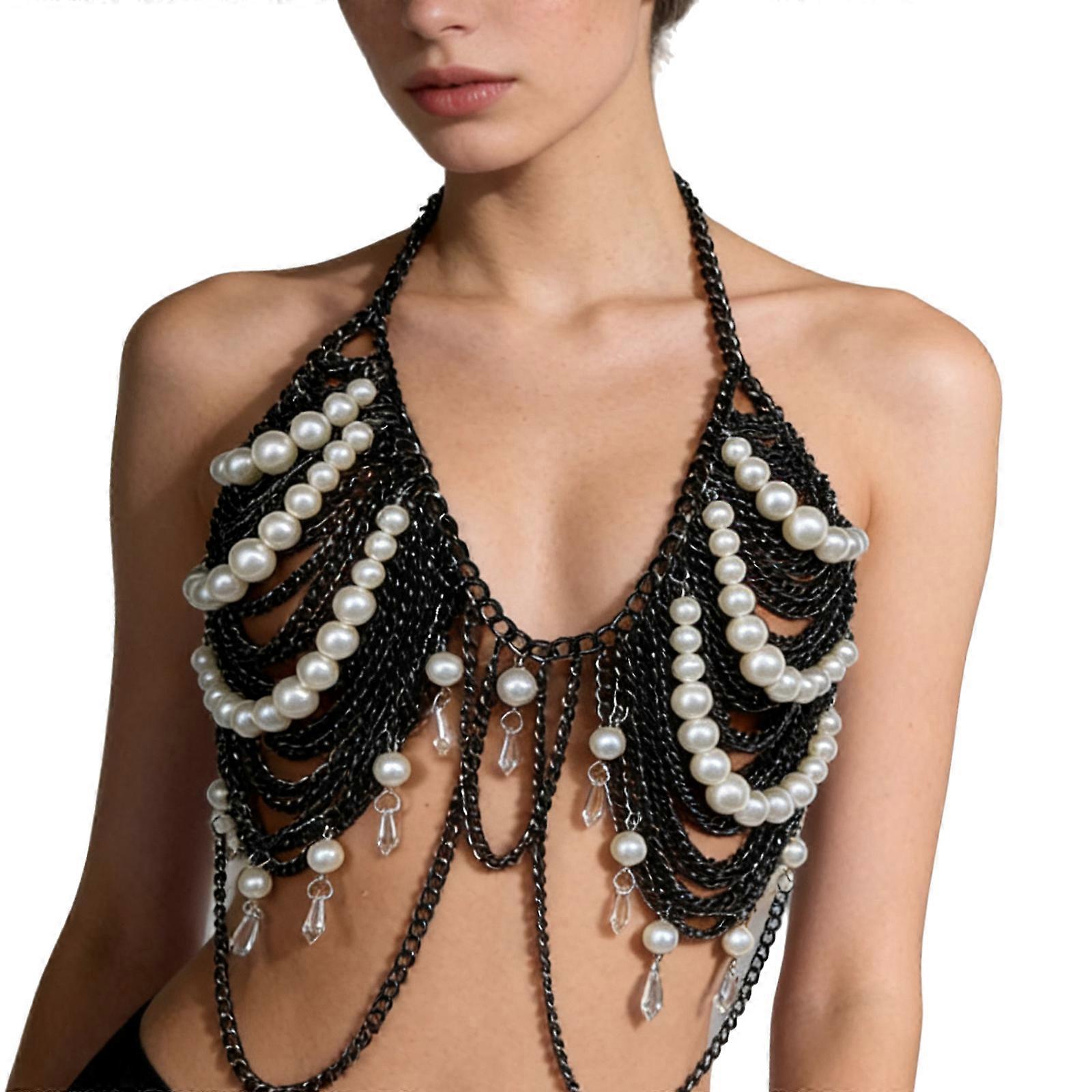 European Styles Vest for Women Faux Pearls Acrylic Chain Detachable Straps Long Wear Fashion Lingerie Underwear Black OS
