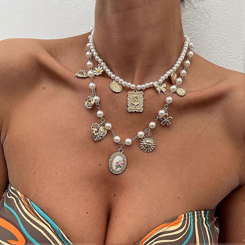 2Pcs/Set Butterfly Sunflower Heart Pendant Necklace for Women Luxury Imitation Pearl Charm Statement Choker Jewelry Gift