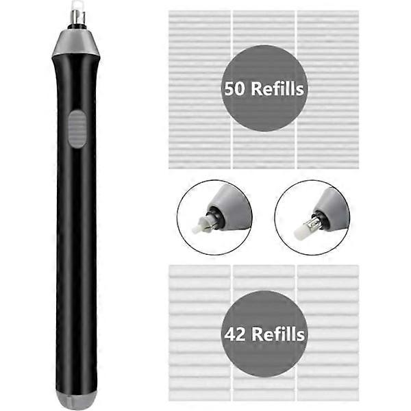 Electric Eraser Kit: The electric eraser kit comes with 42 large refills and 50 small refills that you can use for a long time. One-touch operation: Remove marks with one touch 2 eraser designs: Our electric eraser includes 2 eraser holders that can hold φ2.3mm and φ5mm erasers. Use the larger one to create dense highlights and the smaller one to erase small parts like hair. Perfect for artists and professionals Comfortable handle design: Instead of a large rectangle, this automatic eraser is round, which is more comfortable to hold Powerful erasing power: Circular motion and powerful motor allow you to erase the target area effectively and precisely Battery-operated eraser: Powered by 2 AAA batteries (not included), this electric eraser helps you free your hands to draw and paint Professional electric eraser for work, drawing and learning Perfect tool for artists, students, teachers, children and adults, easy to use Insert the battery 1. Press the battery cover by pressing the arrow on the battery cover 2. Insert 2 AAA batteries according to the positive and negative markings 3. Close the battery cover Operation 1. Press the button and the eraser will start to rotate 2. Rotate back and forth to remove any unnecessary numbers Replace the eraser 1. When the eraser runs out, pull out the eraser holder 2. Then pull out the eraser about 3 mm 3. Back to original, can be reused Electric Eraser Details Package Included 1 x Electric Eraser 42 x 5 mm Eraser Pin 50 x 2.3 mm Eraser Pin Specification Material: Plastic Color: Black Weight: 80 grams Size: 223 x 96 x 18 mm Warning 1. Avoid putting parts in your mouth 2. Powered by 2 AAA batteries (not included) 3. For long-term use, remove the battery when not in use Slim pen This automatic earpiece is not a large rectangle, but a round shape, which is more convenient to hold p> 2 eraser sizes Larger (φ2.3 mm) and smaller (φ5 mm). Use a larger one to create thick highlights and a smaller one to erase small parts like hair Electric Eraser Kit Our electric eraser kit comes with 42 larger (Ø 5 mm) pins and 50 smaller (Ø 2.3 mm) pins that you can use for a long time