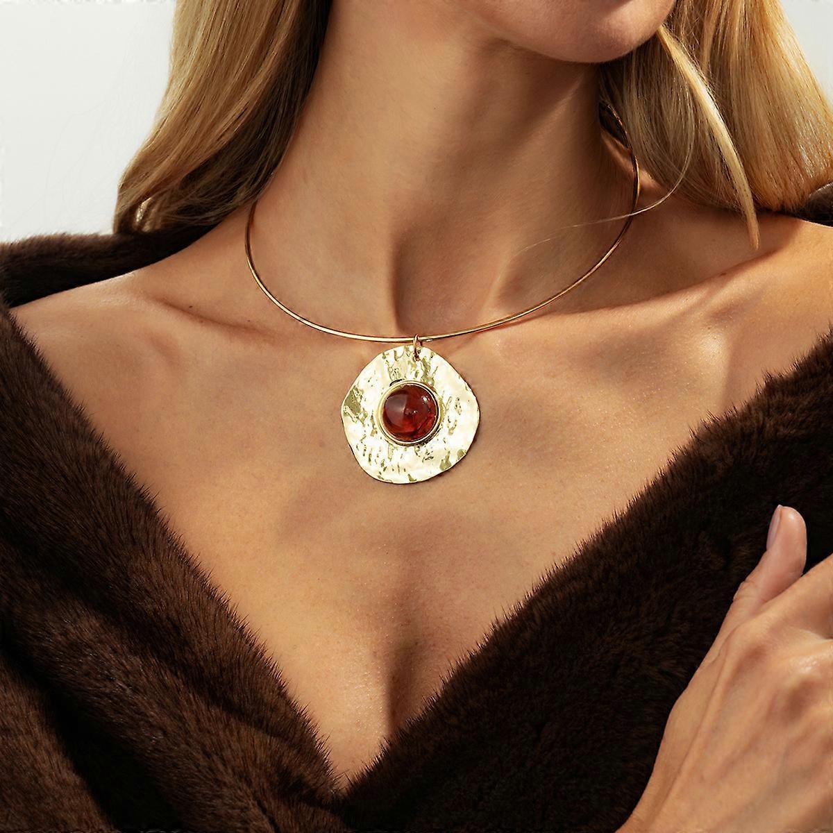 French Retro Liquid Metal Pleated Circular Resin Imitation Gemstone Pendant Collarbone Necklace Women's Jewelry Earring Set