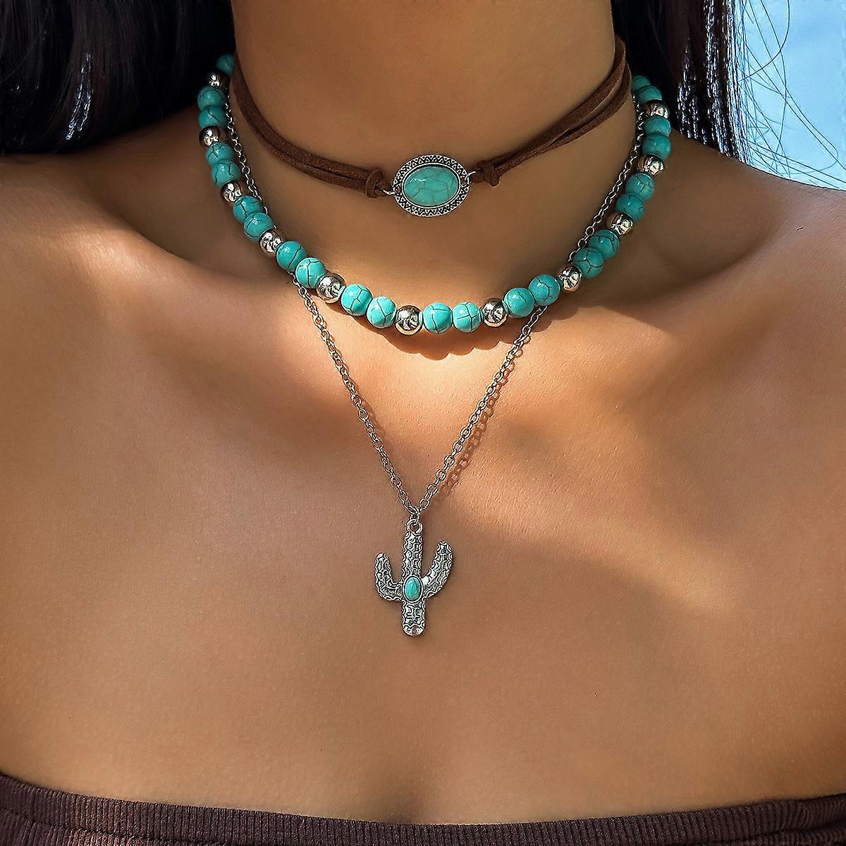 Bohemian Multilayer Blue Stone Beaded Korean Velvet Necklace for Women Men Punk Metal Cactcom Pendant Cross Chain ��ܧ�ѧ�֧ߧڧ�
