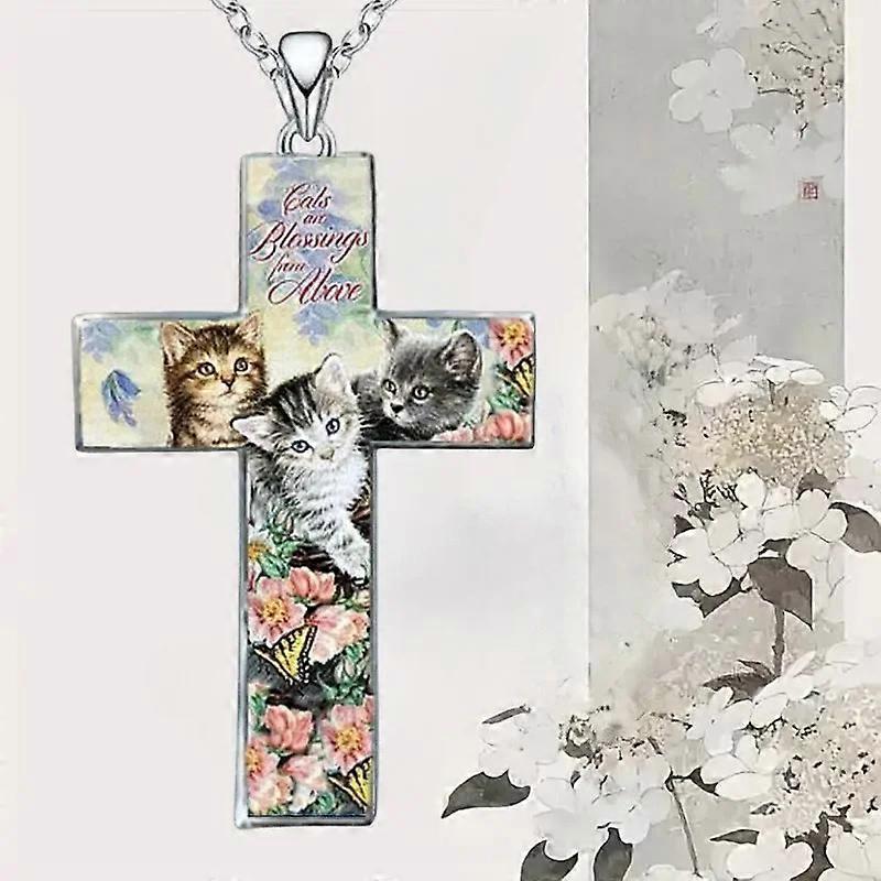 Halloween Painted Cute Cats Cross Pendant Necklace for Women Men Kids Vintage Religiocom Birthday Party Gifts Jewelry Accessories