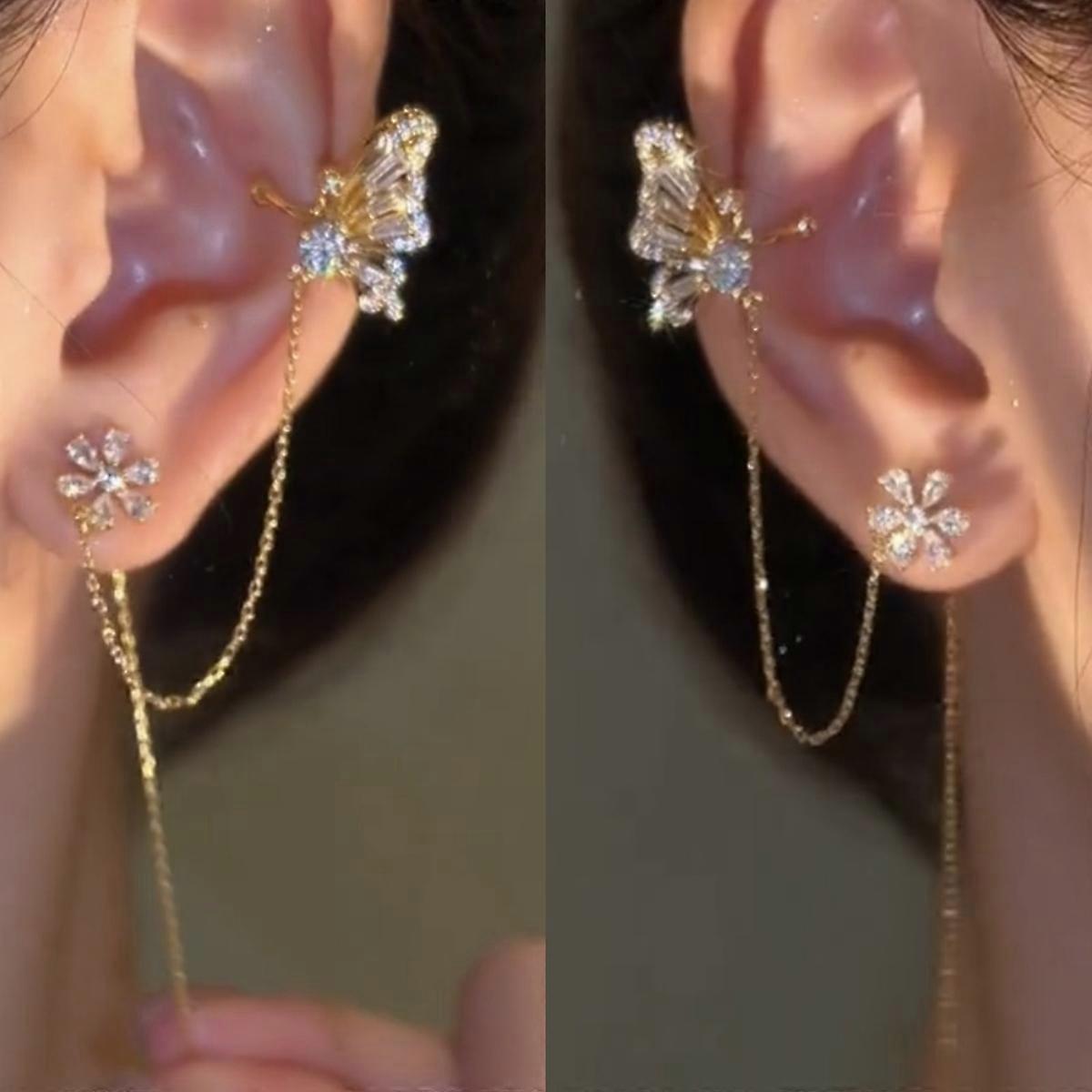 Fashion White Crystal Flower Butterfly Earrings for Women Jewelry 2025 Trendy New Luxury Butterfly Long Tassel Ear Clip Earrings