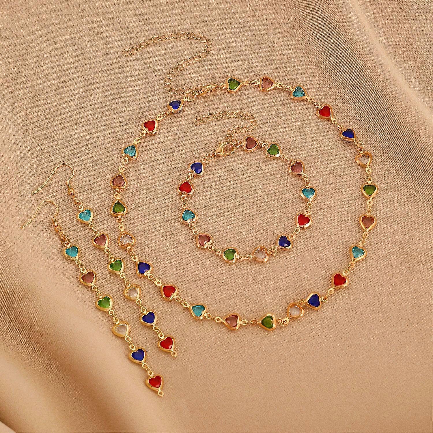 3Pcs Jewellery Set Elegant Colorful Crystal Heart Necklaces Bracelets Earrings for Women Party Wedding Girl Wrist Jewelry Gift