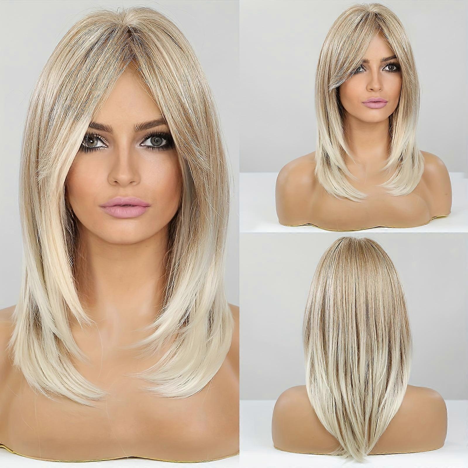 Ombre Blonde Wigs For Women Shoulder Length Layered Straight Synthetic Hair Wig With Curtain Bangs Daily Party Use Wig