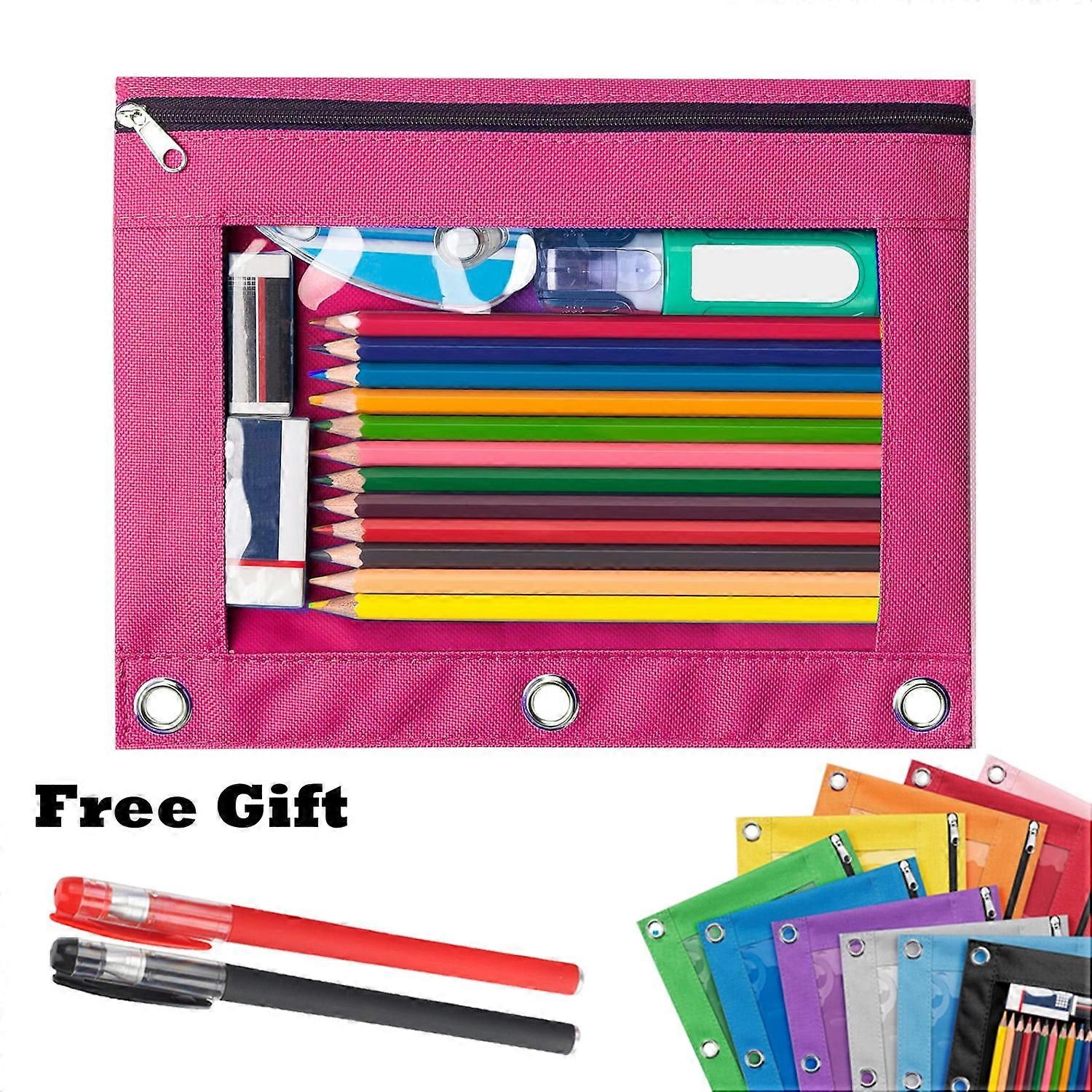 Lksixu Pencil Pouch for 3 Ring Binder, Clear Window Pencil Case with Smooth Zipper, Large Capacity Oxford Cloth Pencil Bag with 3 Reinforced Grommets for Office College, Hot Pink Features: 3-Ring Pen Pocket: Two zippered compartments for storing pens, pencils, markers, and more. Fits standard 3-ring binder. SUPERIOR QUALITY: The metal zipper is and fluid, so you don't have to worry about snagging. TRANSPARENT WINDOW: Allows you to see what you need at glance, easy to take out what you need 1 COMPARTMENT: Main compartment holds the items you want. Recommended minimum age 3 years and up Product Description: Size 25 x 18 cm Material: cloth package includes:1 x Pencil Pouch 【Premium Quality】Made of sturdy waterproof Oxford fabric and durable PVC, with exquisite stitching which makes them have a long lifespan. It matches well with all standard 3 ring binders. Also comes with multiple brilliant different color. There must be a color you like. Convenience for you to storing the different small things. 【Clear PVC Window for Easy Viewing】The transparent plastic window is designed to allow you easily identify the contents inside. You can see the contents of the pocket at a glance, making it easy to get things from inside. 【Smooth Metal Zipper and Reinforcing Grommets】The re-enforced ring grommet keeps your pouch secure in your binder and won't tear off. The smooth and durable zipper doesn't have to worry about it being stuck and protect your documents from falling out. 【Great Capacity】The 3 ring pen pouch size is 9.8"x7.1" (25x18cm), which fits perfectly with a standard 3 ring binder. You can easily carry your stationery with enough space for 20 pencils, erasers, rulers, scissors and other stationery. 【Best Service】We are committed to providing you with high-quality products and excellent customer service. If you receive a defective product or are not satisfied with your purchase for any reason, please contact us immediately and we will do our best to resolve all issues.