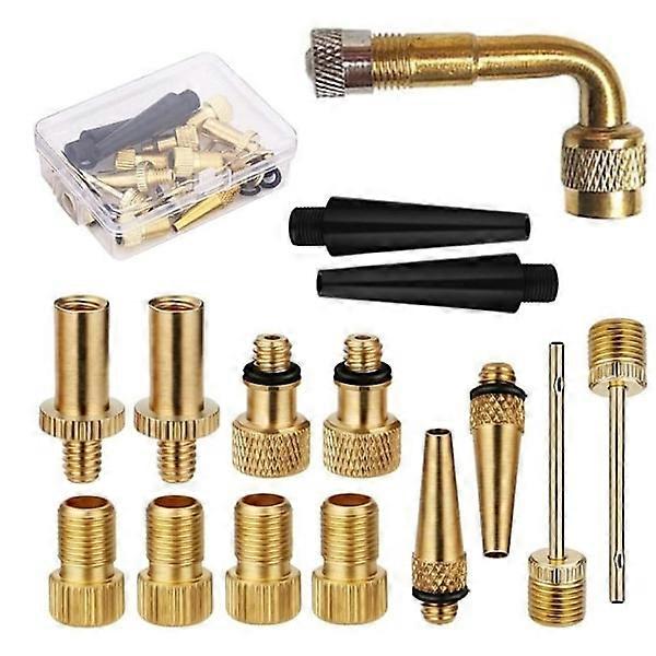 Valve adapter set that enables the adaptation of bicycle valves, other tire valves and inflatable equipment such as balls and the like to different types of air pumps and compressors at, for example, gas stations. Fits in principle all common valves. Specifications: Color: Gold/multicolored Size: 68x52x24 mm Material: Plastic, iron, copper Package includes: 2 x needles for ball valve 4 x conical blow nozzles 2 x SV valve adapter 4 x DV/SV valve adapter 2 x AV valve adapter 1 x extension Adapts the valve to the air pump For various inflatable objects Fits in principle all standard valves Ideal for both tires and toys