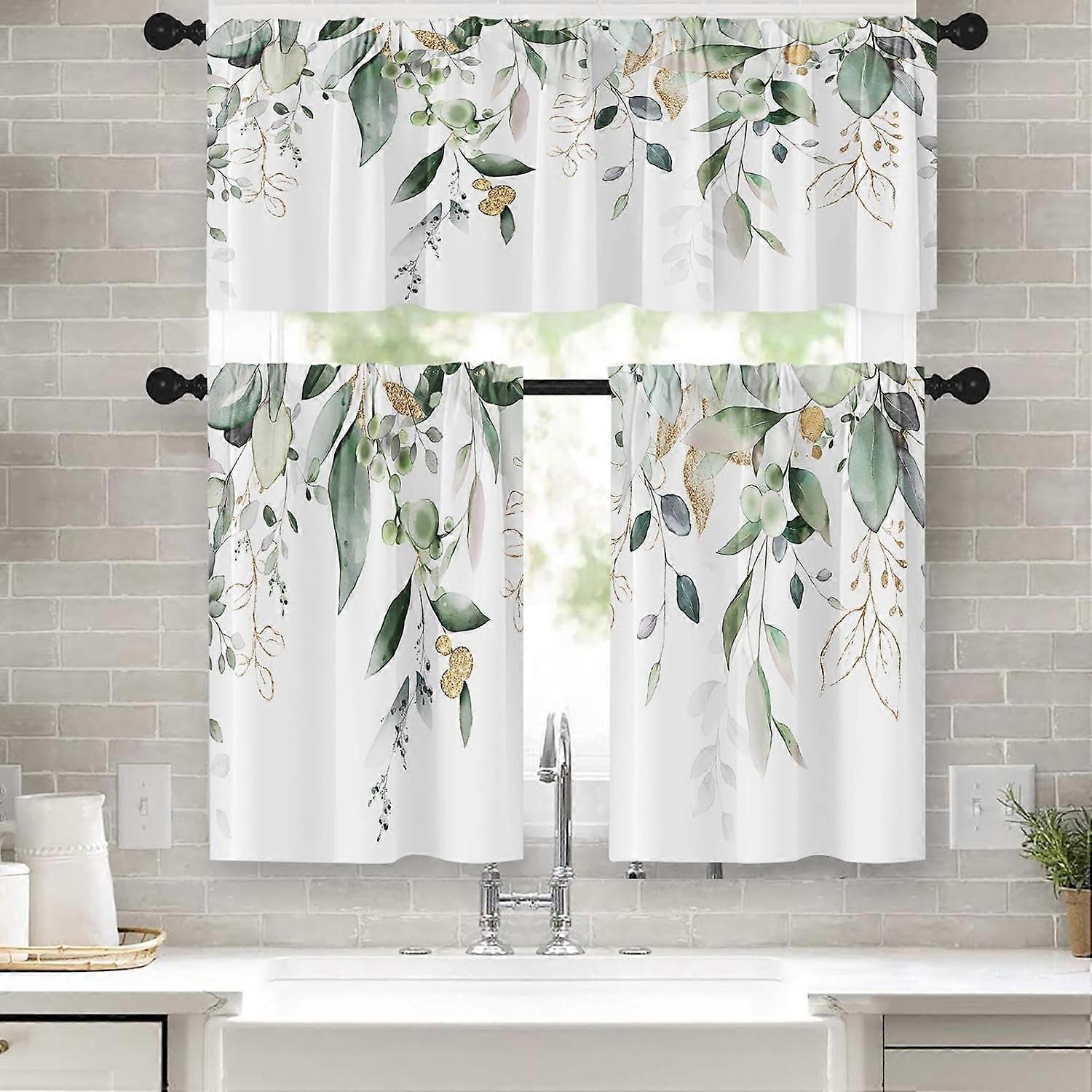 Muqhrev Spring Leaves Tiered Valance Eucalyptus Curtains Set, 36 x 36 in (3 Panels)