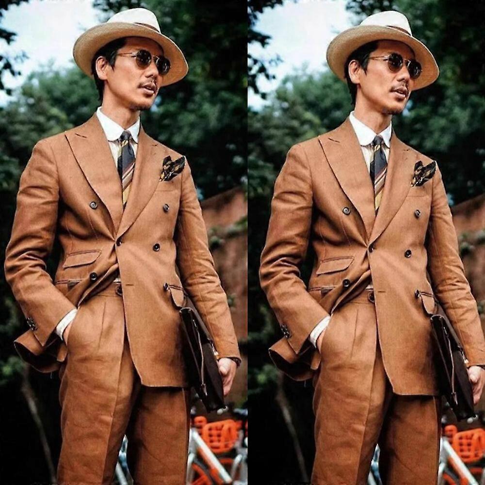 Men Brown Linen Suits Double Breasted Wide Lapel Formal Business Groom Party