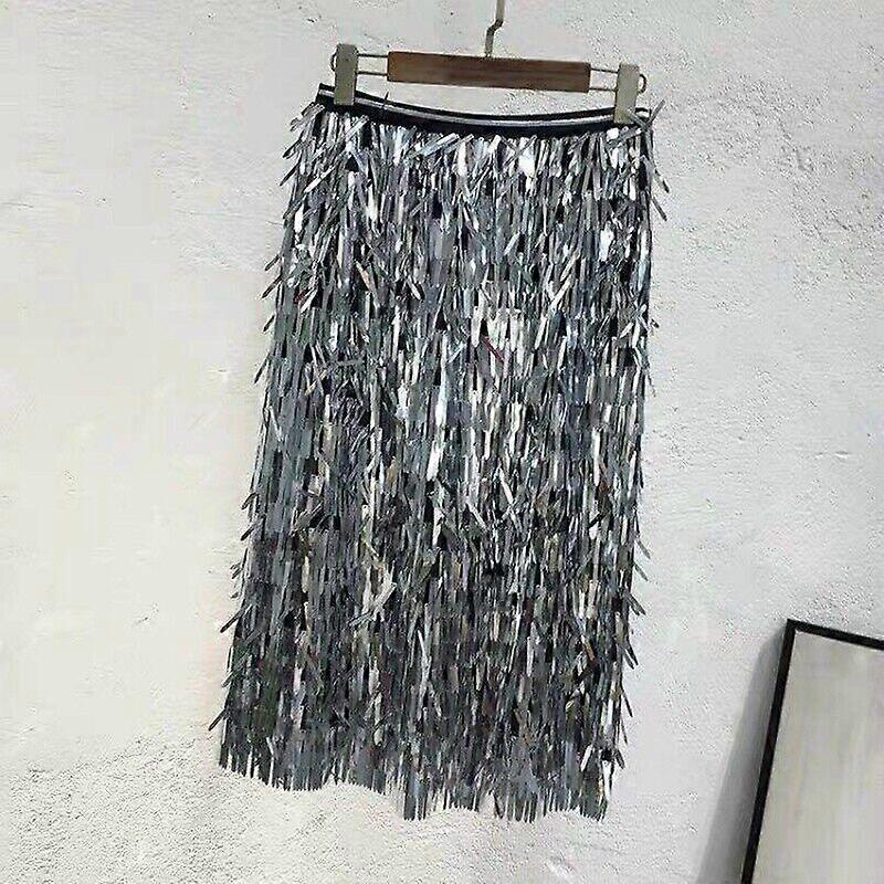 Lady Iridescent Fringe Pencil Skirt TIered Tassel Sequin Midi Bodycon Skirt Slim