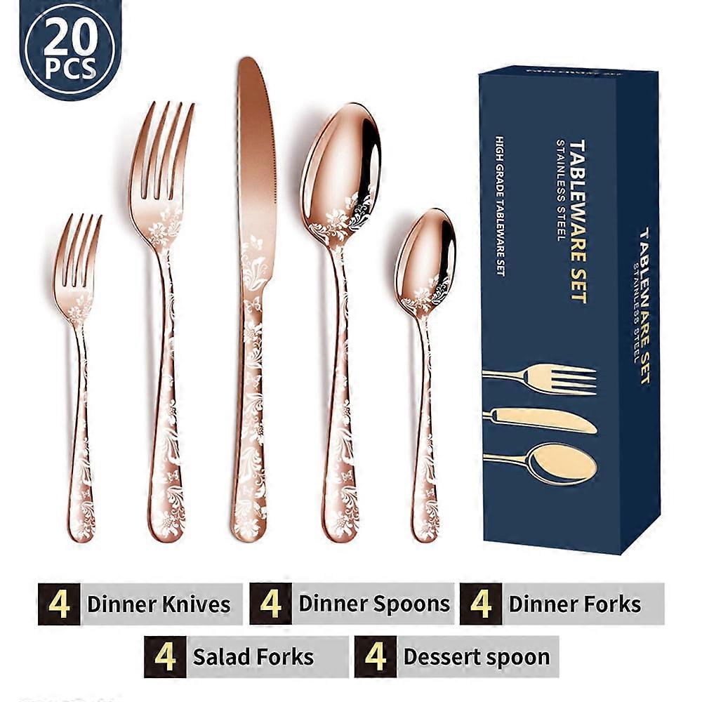 20PCS Stainless Steel Silverware Set, Mirror-Polished Cutlery with Flower Pattern, 4 Knives, 4 Forks, 4 Spoons, 4 Tea Forks, 4 Teaspoons for Kitchen,
