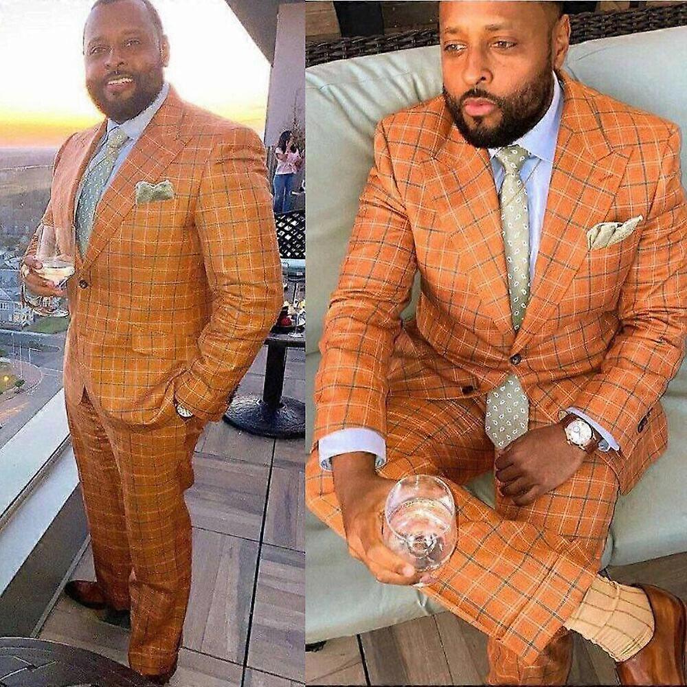 Orange Check Men Wedding Tuxedos Suits Wear Dinner Prom Party Blazer Jacket Pant