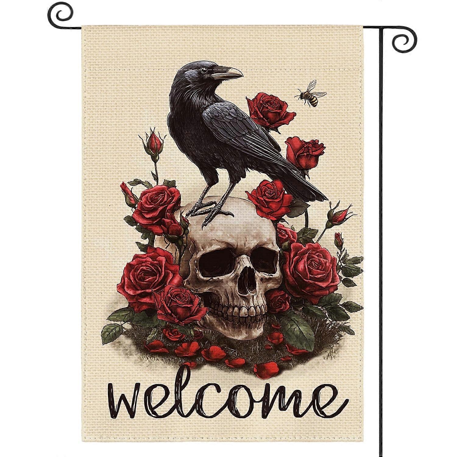 Sm:)e Rose Crow Skull Day of The Dead Garden Flag 12 x 18 Inch, Double Sided, Welcome Burlap Yard Porch Seasonal Holiday Outdoor Decor
