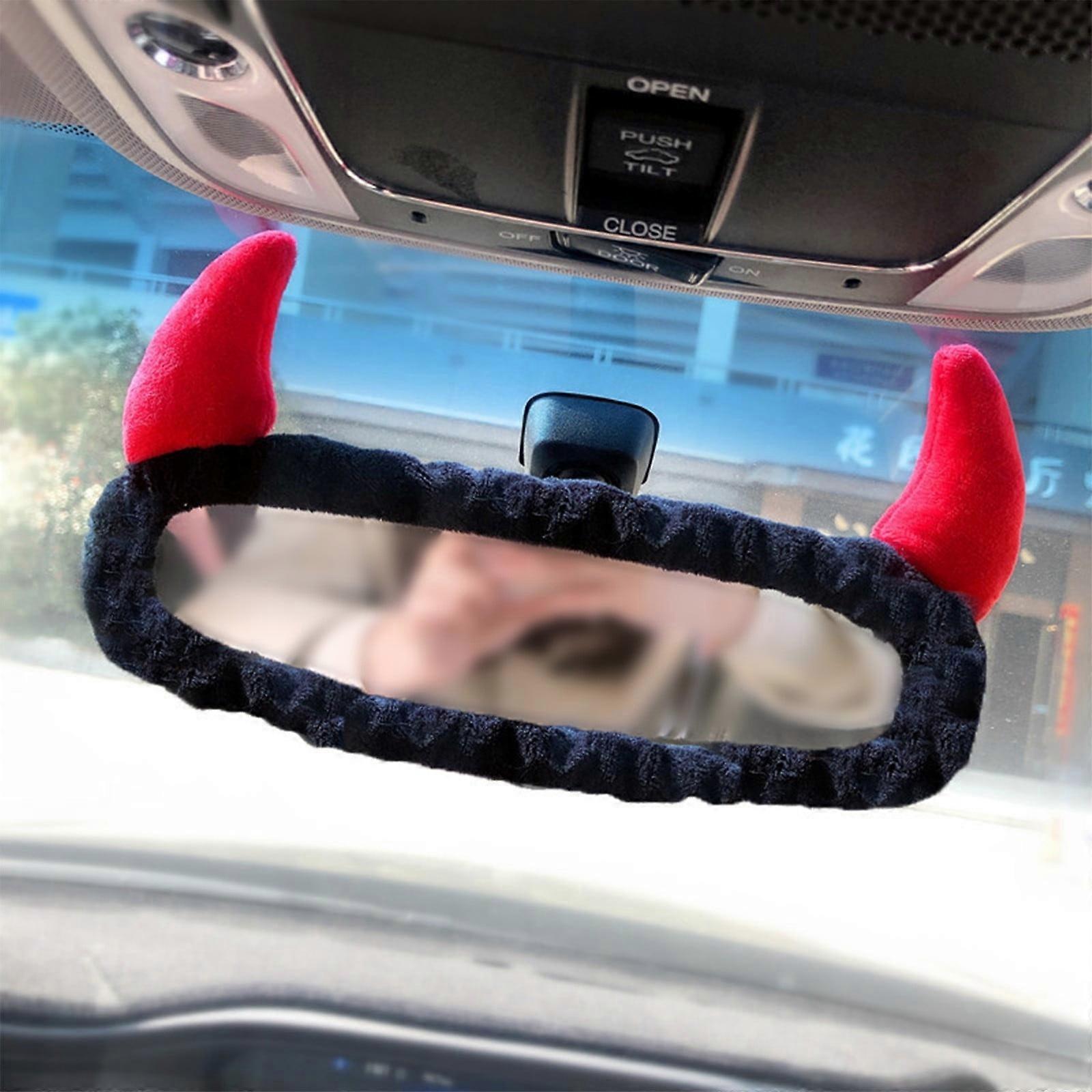 Wadada Car Black Furry Rearview Cover with Devil's Horns & Ghost Stickers - Stretchy Plush Protector, Cute Spooky Laser Decals, Halloween Car