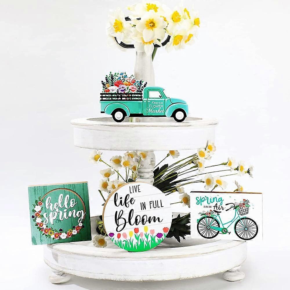 4 Pieces Tiered Tray Decor Farmhouse Rustic Wood Signs Spring Summer Decorations for Home Kitchen Shelf Coffee Bar Table