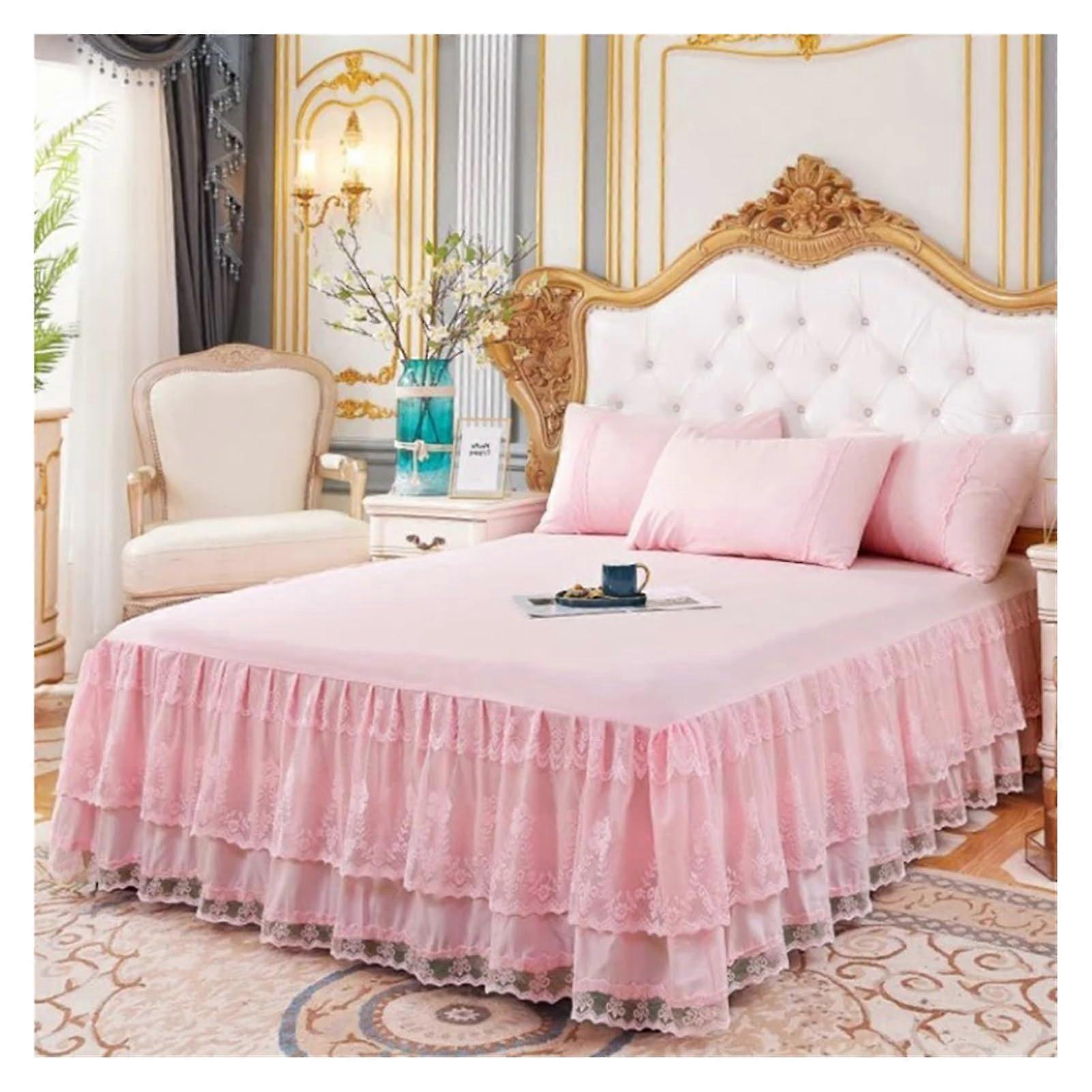 Pink Ruffled Lace Bed Skirt with Deep Pocket Fitted Sheet Queen Size for Romantic Bedroom Style