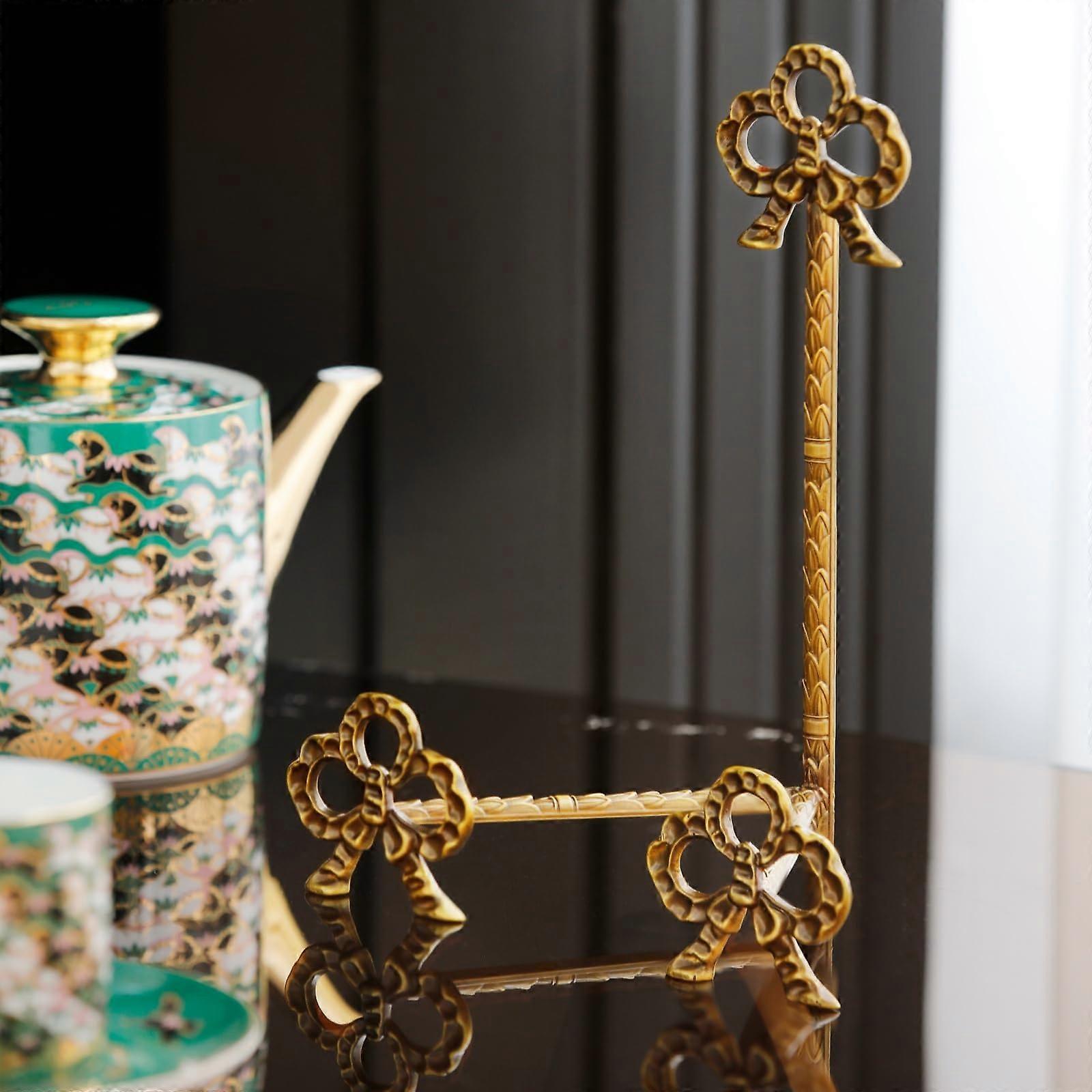 Brass Plate Stand with Vintage Bow Design, 8 Inch Antique Gold Holder for Plates, Frames and Collectibles