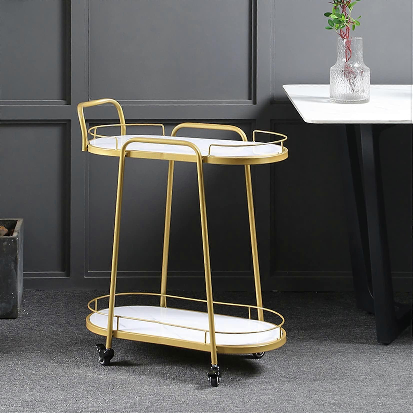 Gold Rolling Bar Cart with Lockable Wheels, Vintage Kitchen Serving Trolley with Guardrail