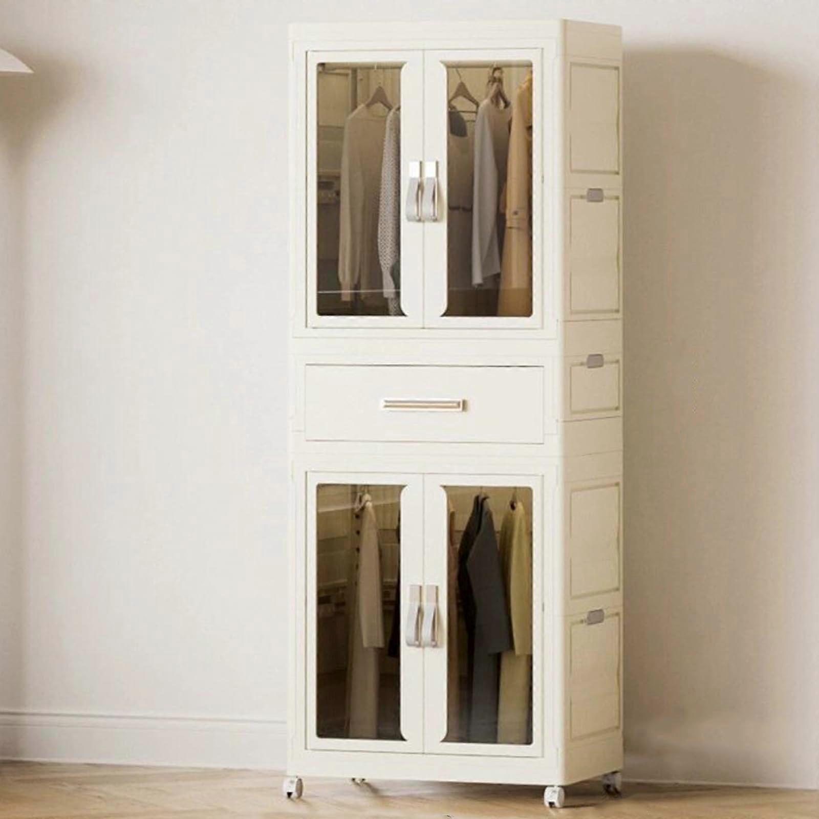 Large Kids Wardrobe Closet with Wheels, Hanging Rod, Drawer, ChildSafe Edges and Transparent Doors