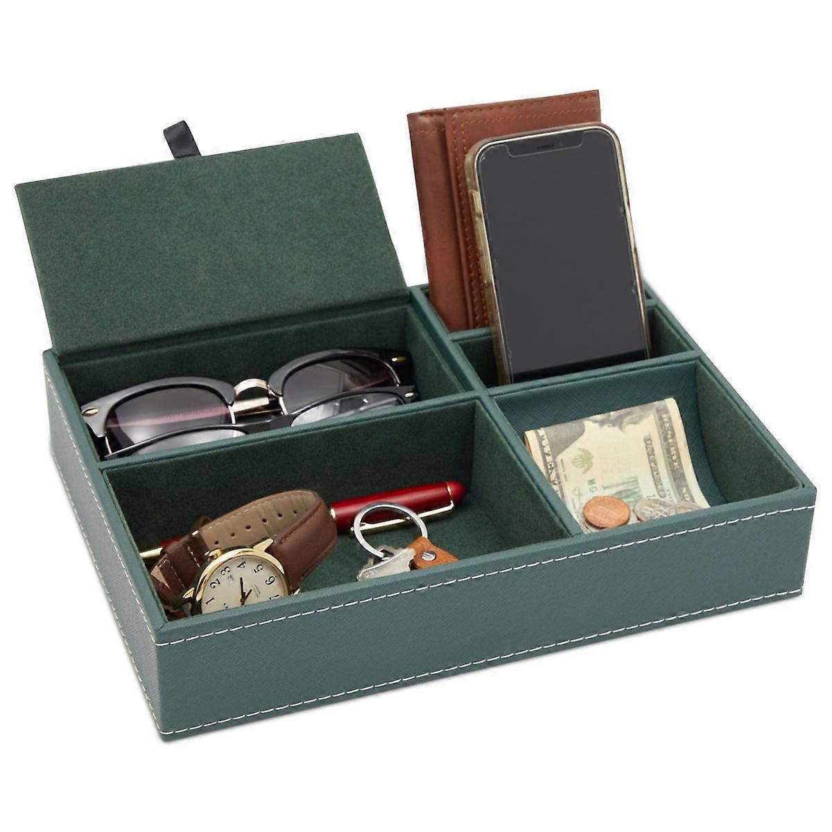 5 Compartment Emerald Green Leather Valet Tray for Wallet, Keys (10 x 7.3 x 2 In)