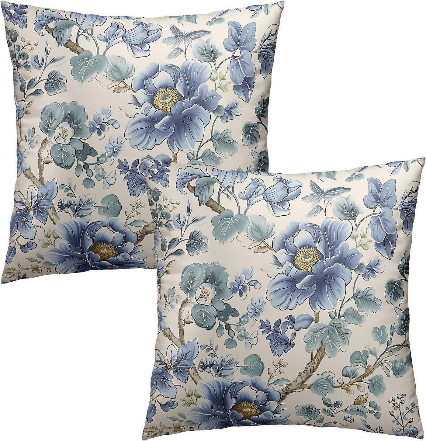 Blue Flower Throw Pillow Cover 20x20 Inch Set of 2, Compatible with Blue and White Chinoiserie Floral Decorative Cushion Covers, Cotton Square for