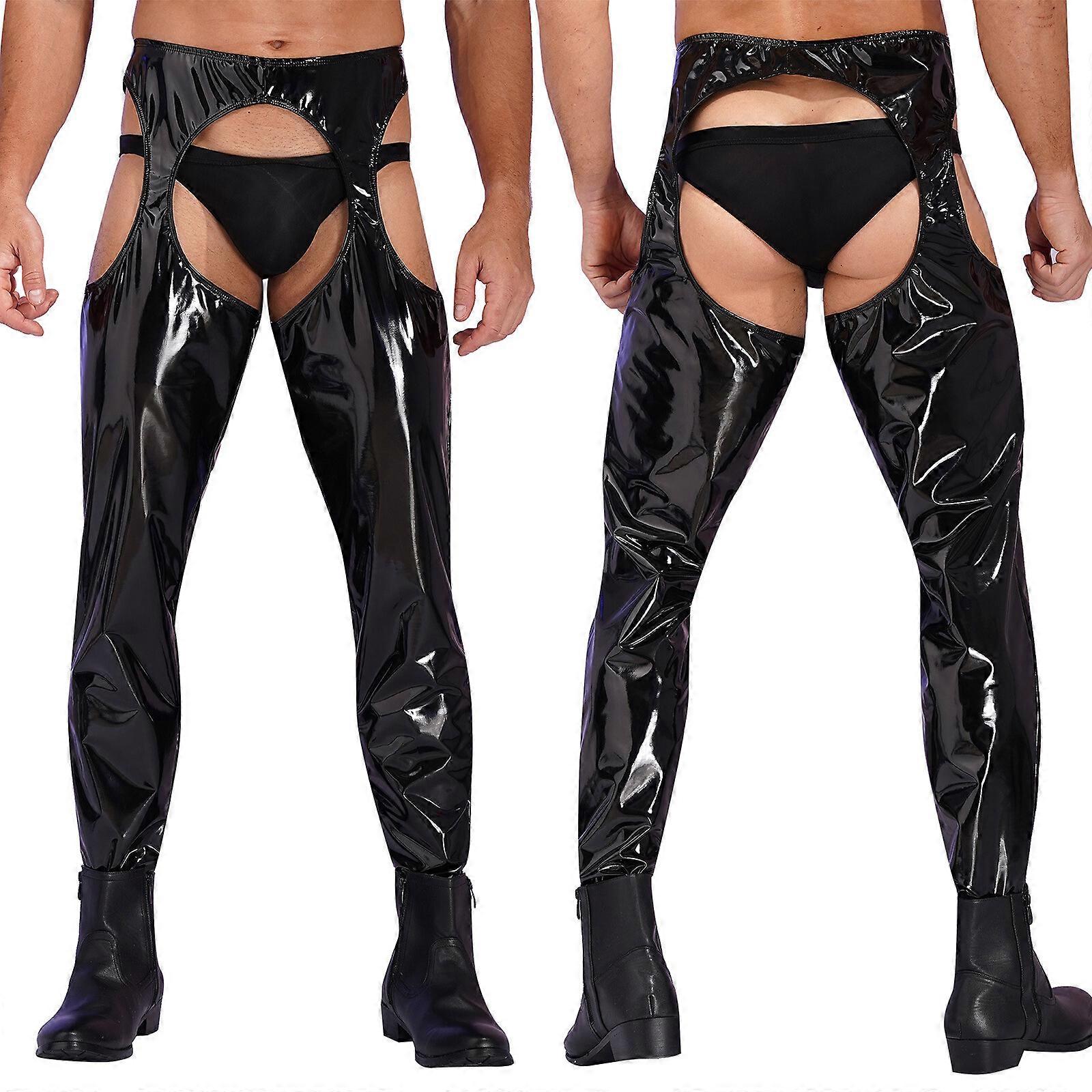 Men Crotchless Pants High Waist Tights Openbutt Patent Leather Trousers Clubwear