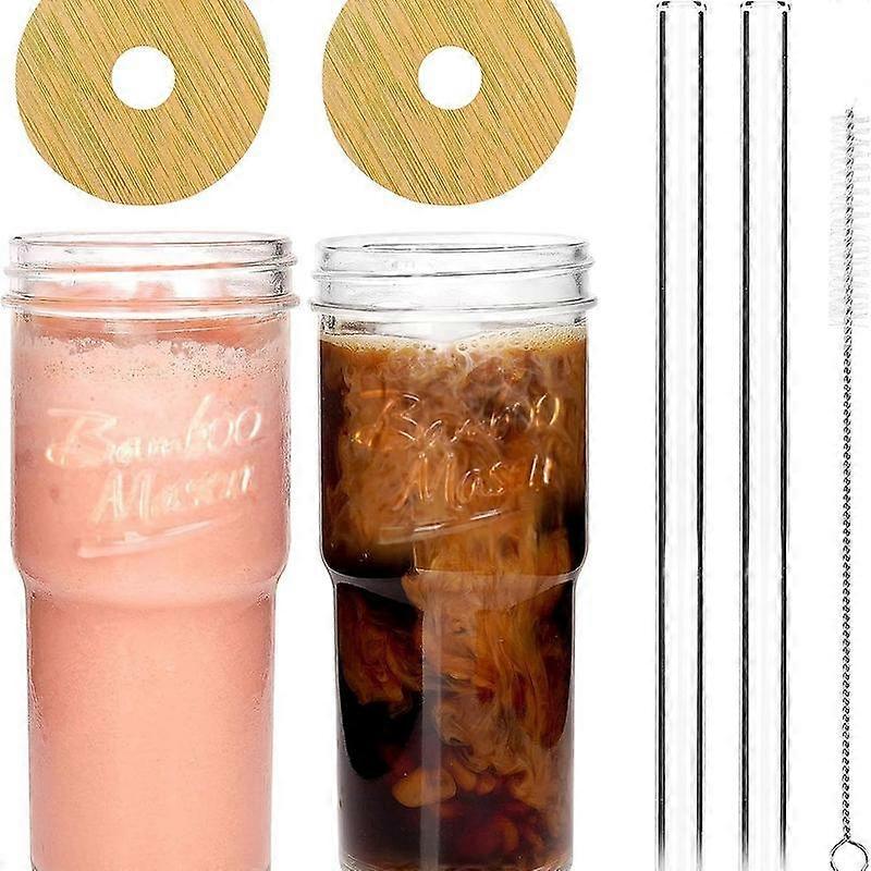 ANOTION 24oz Glass Cups with bamboo Lids and Straws 2 Packs, Travel Coffee Mug Wide Mouth Mason Jar Clear Cute Water Drinking Jars Glasses