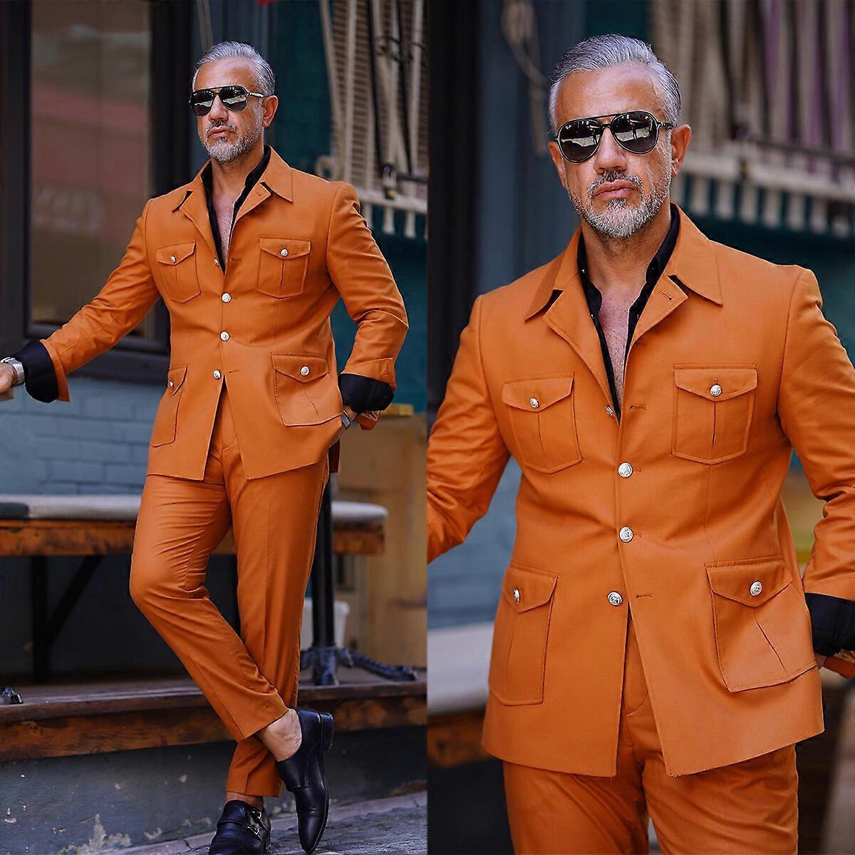 Orange Vintage Men's Safari Jackets 2 Pieces Hunting Sports Suits Slim Fit Coat