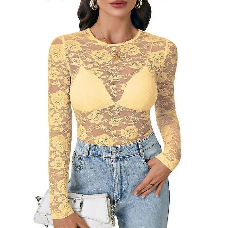 LYANERS Women's Sexy Mesh Top Floral Long Sleeve See Through Shirt Lace Sheer Blouses Womenswear Bodysuits