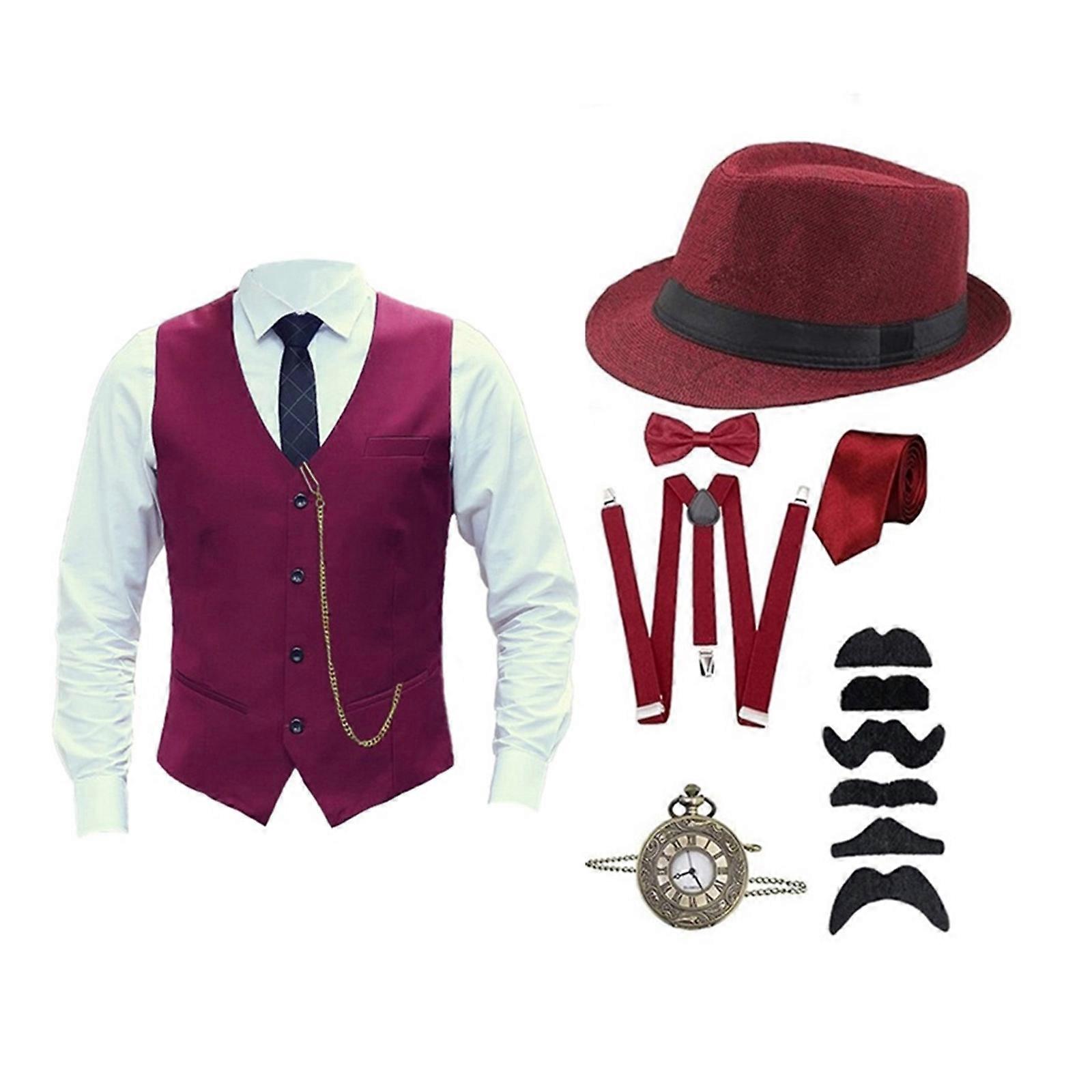 Complete 1920s Themed Costume Set 8Pcs Such As Vest Hat And Pocket Watch Party Supplies For Role Player Party Costume for event Red XL