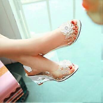 6.5CM Wedges Sandals Women Summer Sweet Flowers Transparent Open Toe Heels Sandals Fishmouth Red Sandals Plus Size49