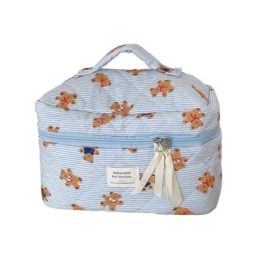 Soft Blue Bear Pattern Makeup Bag Zipper Closure Cotton Cloth Cosmetic Bag Quilting Design Storage Bag Travel Use