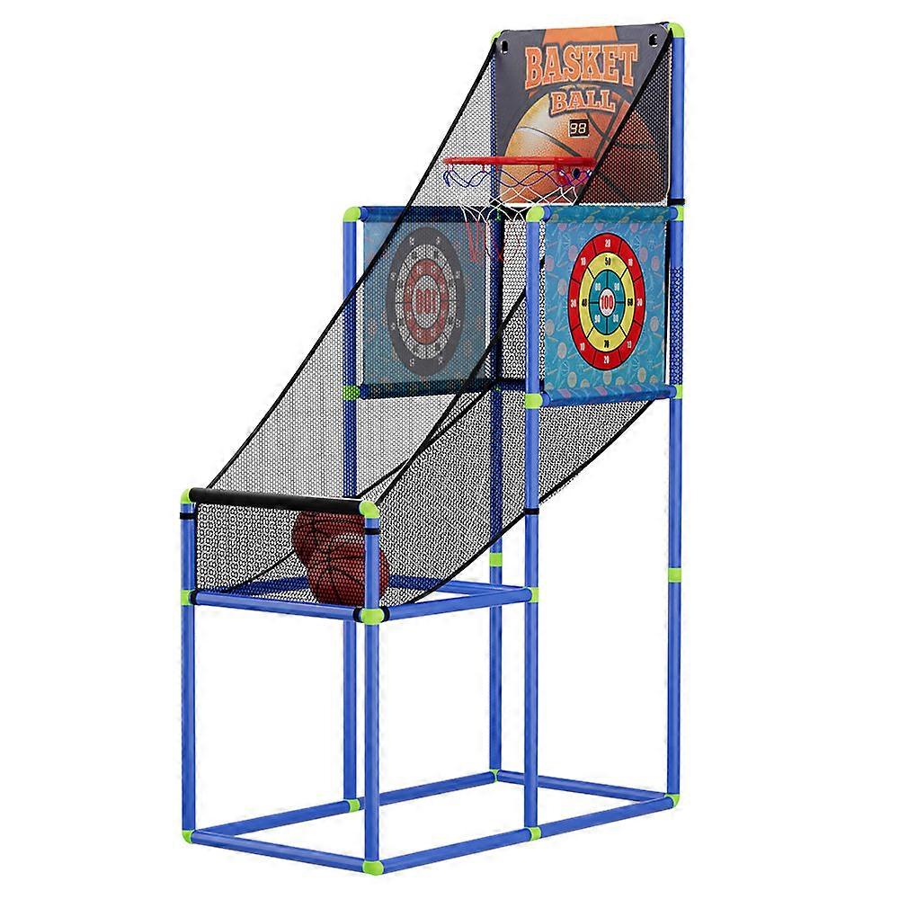 Electronic Score Counter With Lcd Display For Accurate Scoring. Realistic Sound Effects For An Authentic arcade Experience. Three Game Modes: Central Basketball Shooting And Sticky Ball Games On Each Side. Sturdy Construction With Triangle Frame Design And Anti-Slip Feet For Stability. Height To Accommodate All Ages. High-Elastic Ball Return Net For Fast Gameplay. Safe Rounded Corners To Prevent Injuries. Bonus Included: 1 Ball Pump And 2 Basketballs. Indoor And Outdoor Use. Easy Foldable And Quick To Assemble With hook-and-loop tape Design. Specifications: