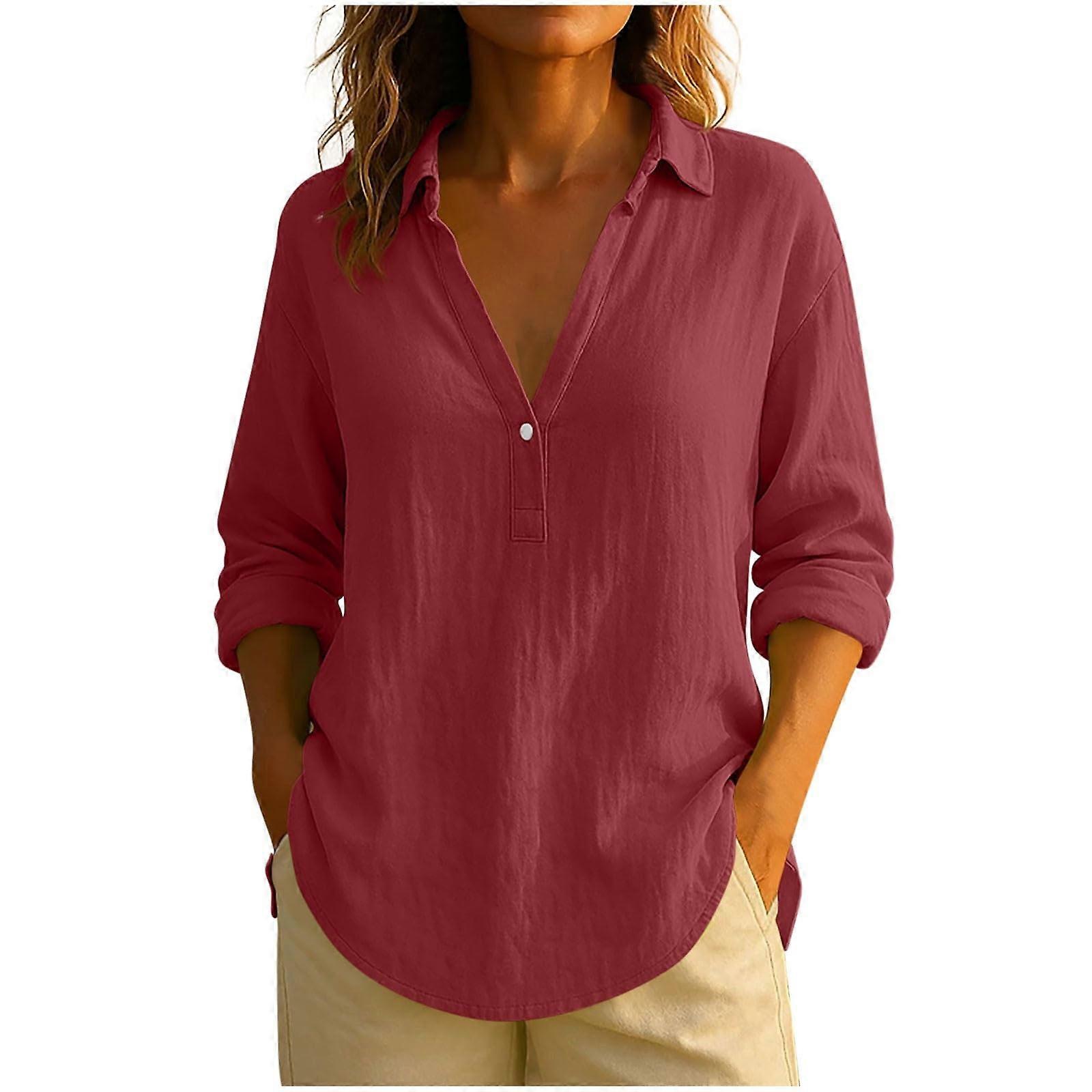 Women's linen top, casual formal shirt, long-sleeved women's blouse, fashionable beach linen clothing Red XL