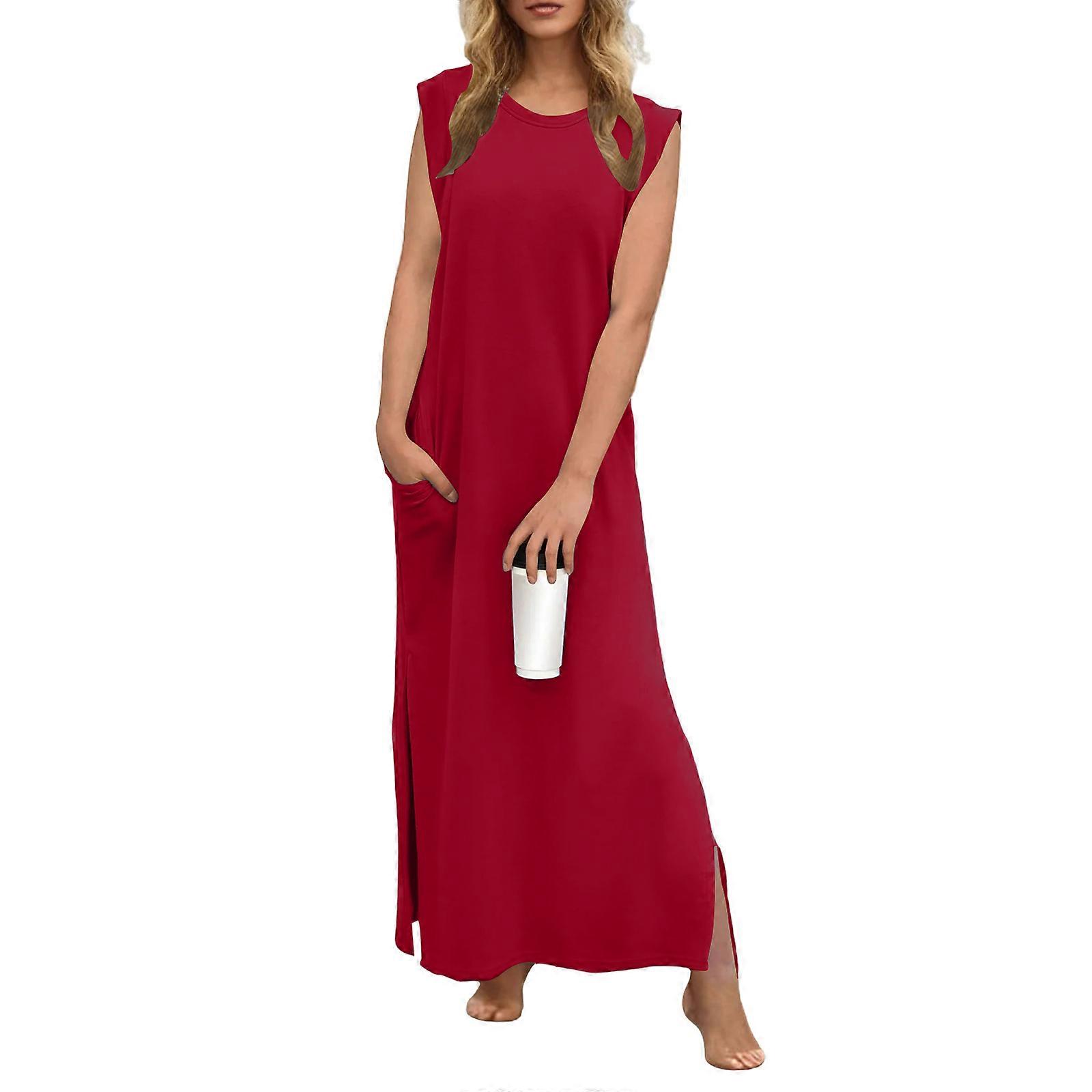 Womens Sleeveless Dress Round Neck A Line Soft Bottom Slit With Pocket Casual Trendy Long Dresses Burgundy XL